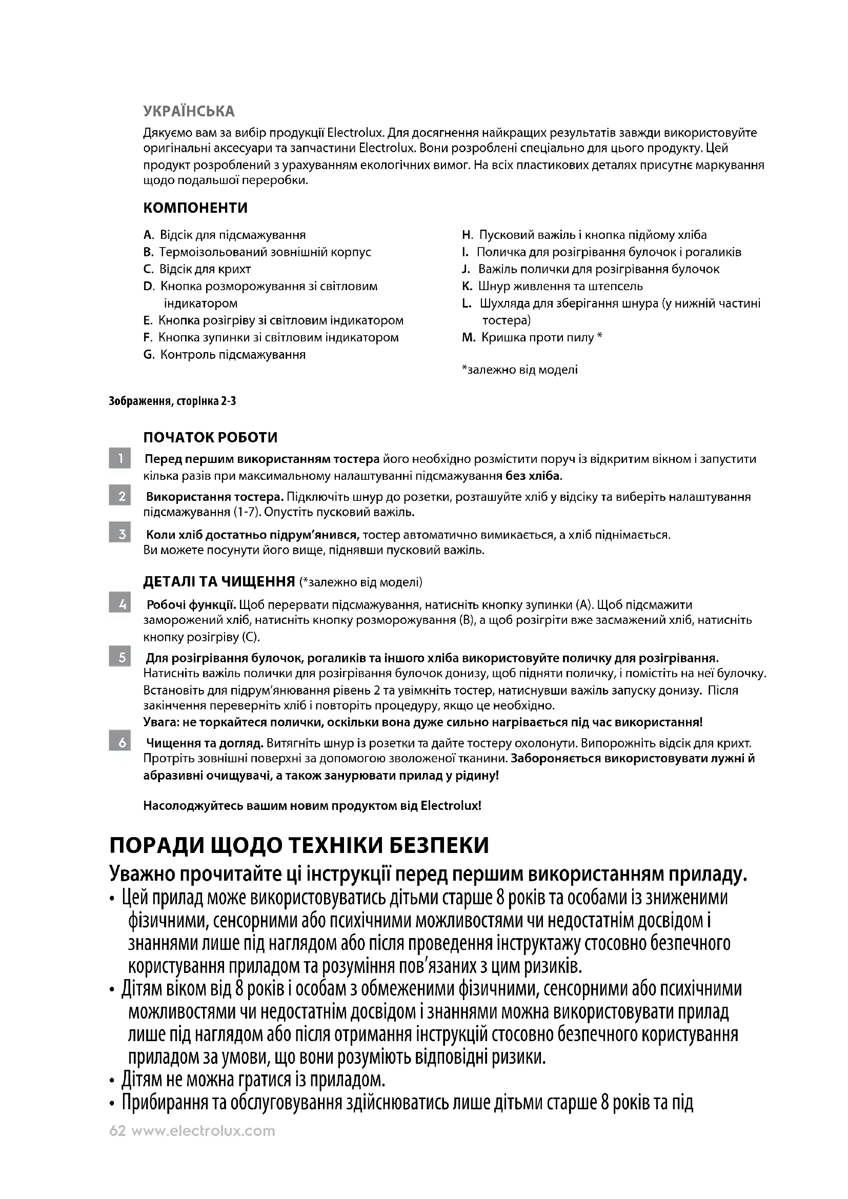 M. Кришка проти пилу * *залежно від моделі Зображення, сторінка 2-3 ПОЧАТОК РОБОТИ 1 Перед першим використанням тостера його необхідно розмістити поруч із відкритим вікном і запустити кілька разів при максимальному налаштуванні підсмажування без хліба. 2 Використання тостера. Підключіть шнур до розетки, розташуйте хліб у відсіку та виберіть налаштування підсмажування (1-7). Опустіть пусковий важіль. 3 Коли хліб достатньо підрум’янився, тостер автоматично вимикається, а хліб піднімається. Ви можете посунути його вище, піднявши пусковий важіль. ДЕТАЛІ ТА ЧИЩЕННЯ (*залежно від моделі) 4 Робочі функції. Щоб перервати підсмажування, натисніть кнопку зупинки (А). Щоб підсмажити заморожений хліб, натисніть кнопку розморожування (В), а щоб розігріти вже засмажений хліб, натисніть кнопку розігріву (С). 5 Для розігрівання булочок, рогаликів та іншого хліба використовуйте поличку для розігрівання. Натисніть важіль полички для розігрівання булочок донизу, щоб підняти поличку, і помістіть на неї булочку. Встановіть для підрум’янювання рівень 2 та увімкніть тостер, натиснувши важіль запуску донизу. Після закінчення переверніть хліб і повторіть процедуру, якщо це необхідно. Увага: не торкайтеся полички, оскільки вона дуже сильно нагрівається під час використання! 6 Чищення та догляд. Витягніть шнур із розетки та дайте тостеру охолонути. Випорожніть відсік для крихт. Протріть зовнішні поверхні за допомогою зволоженої тканини. Забороняється використовувати лужні й абразивні очищувачі, а також занурювати прилад у рідину! Насолоджуйтесь вашим новим продуктом від Electrolux! ПОРАДИ ЩОДО ТЕХНІКИ БЕЗПЕКИ Уважно прочитайте ці інструкції перед першим використанням приладу.