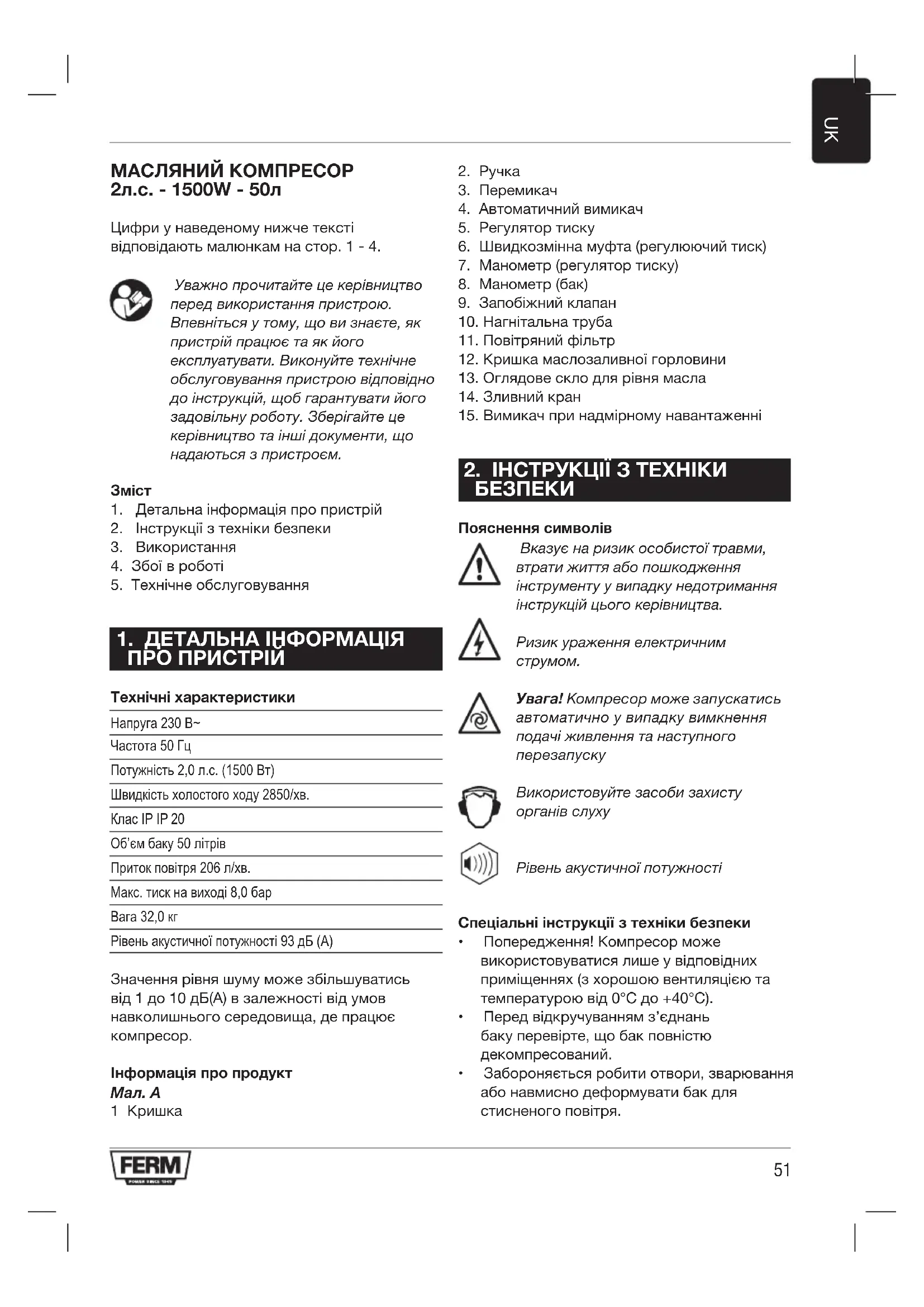 Увага!Компресорможезапускатись автоматичноувипадкувимкнення подачіживленнятанаступного перезапуску Використовуйтезасобизахисту органівслуху Рівеньакустичноїпотужності