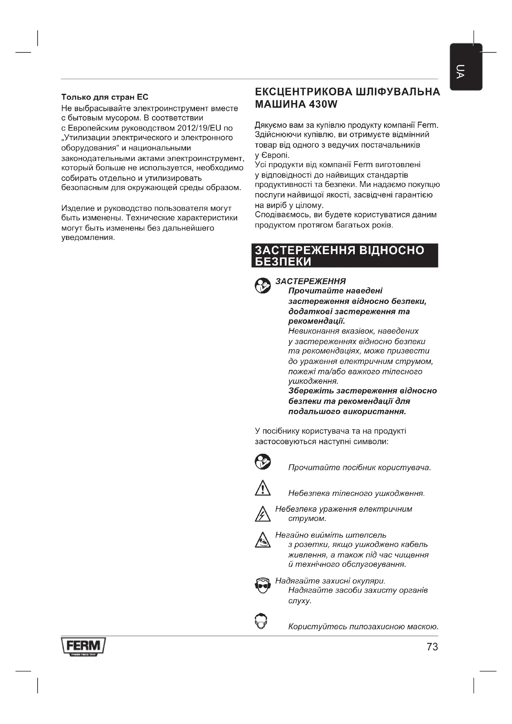 УсіпродуктивідкомпаніїFermвиготовлені увідповідностідонайвищихстандартів продуктивностітабезпеки.Минадаємопокупцю послугинайвищоїякості,засвідченігарантією навирібуцілому. Сподіваємось,вибудетекористуватисяданим продуктомпротягомбагатьохроків. ЗАСТЕРЕЖЕННЯ ВІДНОСНО