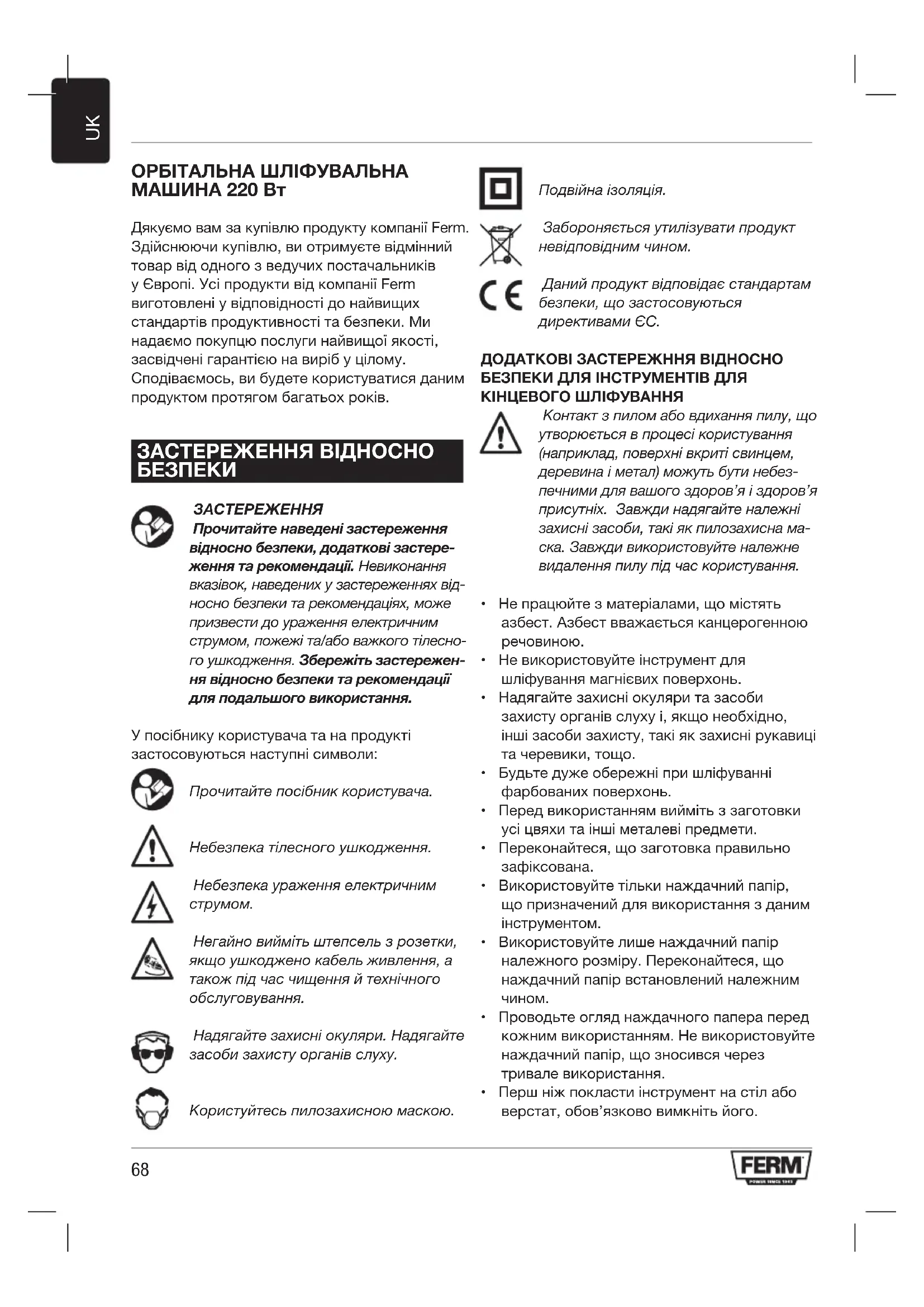 ОРБІТАЛЬНА ШЛІФУВАЛЬНА МАШИНА 220 Вт Дякуємо вам за купівлю продукту компанії Ferm. Здійснюючи купівлю, ви отримуєте відмінний товар від одного з ведучих постачальників у Європі. Усі продукти від компанії Ferm виготовлені у відповідності до найвищих стандартів продуктивності та безпеки. Ми надаємо покупцю послуги найвищої якості, засвідчені гарантією на виріб у цілому. Сподіваємось, ви будете користуватися даним продуктом протягом багатьох років. ЗАСТЕРЕЖЕННЯ ВІДНОСНО