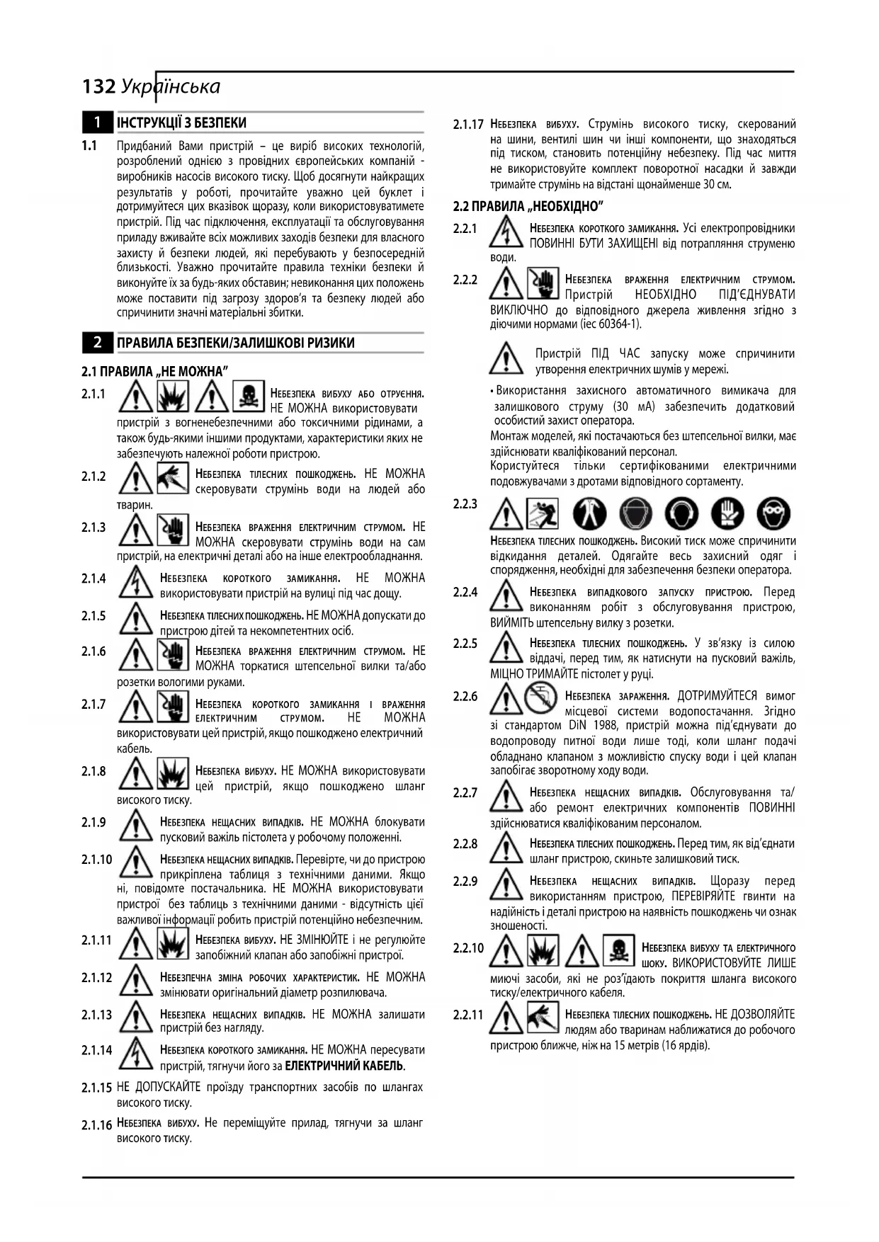 розроблений однією з провідних європейських компаній - виробників насосів високого тиску. Щоб досягнути найкращих результатів у роботі, прочитайте уважно цей буклет і дотримуйтеся цих вказівок щоразу, коли використовуватимете пристрій. Під час підключення, експлуатації та обслуговування приладу вживайте всіх можливих заходів безпеки для власного захисту й безпеки людей, які перебувають у безпосередній близькості. Уважно прочитайте правила техніки безпеки й виконуйте їх за будь-яких обставин; невиконання цих положень може поставити під загрозу здоров’я та безпеку людей або спричинити значні матеріальні збитки.