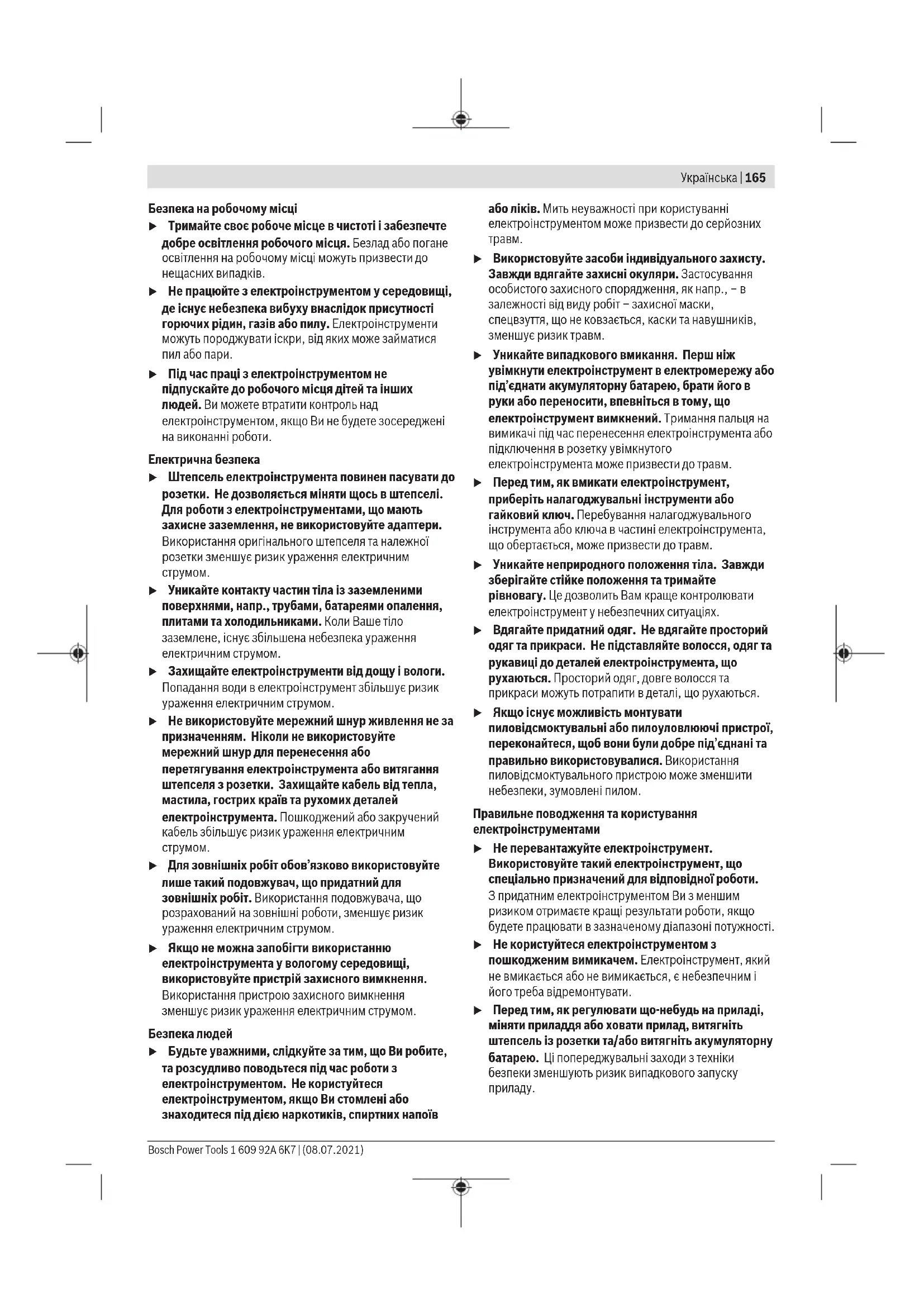 u Ніколи не тримайте руку поблизу від робочого інструмента, що обертається. При сіпанні робочий інструмент може відскочити Вам на руку. u Уникайте своїм корпусом місць, куди в разі сіпання може відскочити електроінструмент. При сіпанні електроінструмент відскакує в напрямку, протилежному руху шліфувального круга в місці застрявання. u Працюйте з особливою обережністю в кутах, на гострих краях тощо. Запобігайте відскакуванню робочого інструмента від оброблюваного матеріалу та його заклинюванню. В кутах, на гострих краях або при відскакуванні робочий інструмент може заклинюватися. Це призводить до втрати контролю або сіпання. u Не використовуйте ланцюгові пиляльні диски та пиляльні диски з зубцями. Таке приладдя часто спричиняе сіпання або втрату контролю над електроінструментом. Особливі вказівки з техніки безпеки для шліфування та відрізання u Використовуйте лише шліфувальні круги, дозволені для цього електроінструмента, та захисний кожух, передбачений для відповідного шліфувального круга. Шліфувальні круги, що не передбачені для цього електроінструменту, не можна достатньою мірою прикрити, тому вони небезпечні. u Вигнуті шліфувальні круги потрібно монтувати таким чином, щоб їх робоча поверхня не виступала за край захисного кожуха. Неправильно монтований шліфувальний круг, що виступає за край захисного кожуха, не можна достатньо захистити. u Захисний кожух треба надійно встановити на електроінструменті та відрегулювати з досягненням максимальної безпеки таким чином, щоб на оператора дивилася якомога менша частина неприкритого шліфувального інструмента. Захисний кожух захищає оператора від уламків, випадкового контакту із шліфувальним інструментом та від іскор, від яких міг би зайнятися одяг. u Шліфувальні круги можна використовувати лише для рекомендованих видів робіт. Наприклад: ніколи не шліфуйте боковою поверхнею відрізного круга. Відрізні круги призначені для знімання Bosch Power Tools 1 609 92A 6K7 | (08.07.2021)168 | Українська матеріалу кромкою круга. Бічне навантаження може зламати такий круг. u Завжди використовуйте для вибраного шліфувального круга непошкоджений затискний фланець відповідного розміру та форми. Придатний фланець підтримує відрізний круг і, таким чином, зменшує небезпеку перелому круга. Фланці для відрізних кругів можуть відрізнятися від фланців для шліфувальних кругів. u Не використовуйте зношені круги, що вживалися на електроінструментах більших розмірів. Призначені для більших електроінструментів круги не розраховані на більшу кількість обертів менших електроінструментів та можуть ламатися. Інші особливі попередження при відрізанні шліфувальним кругом u Уникайте застрявання відрізного круга або занадто сильного натискання. Не робіть занадто глибоких надрізів. Занадто сильне натискання на відрізний круг збільшує навантаження на нього та його схильність до перекосу або застрявання і таким чином збільшує можливість сіпання або ламання шліфувального круга. u Уникайте зони попереду та позаду відрізного круга. Якщо Ви пересуваєте відрізний круг в оброблюваному матеріалі в напрямку від себе, при сіпанні електроінструмент з кругом може відскочити прямо на Вас. u Якщо відрізний круг заклинить або Ви навмисно зупините різання, вимкніть електроінструмент та тримайте його, не рухаючись, поки кр