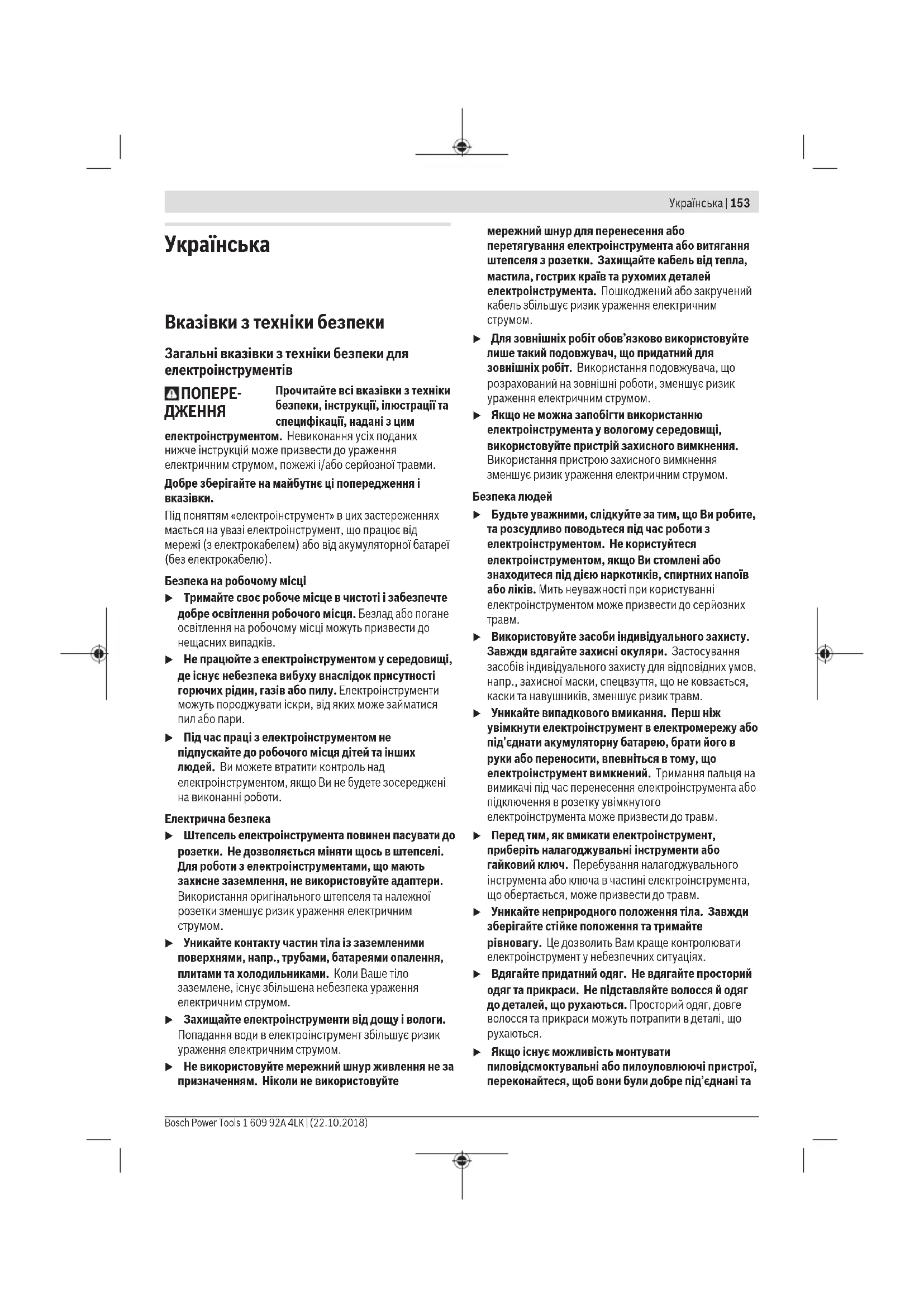 Аккумуляторы/батареи: Литий-ионные: Пожалуйста, учитывайте указание в разделе Транспорти- ровка (см. „Транспортировка“, Страница152).Українська Вказівки з техніки безпеки Загальні вказівки з техніки безпеки для електроінструментів