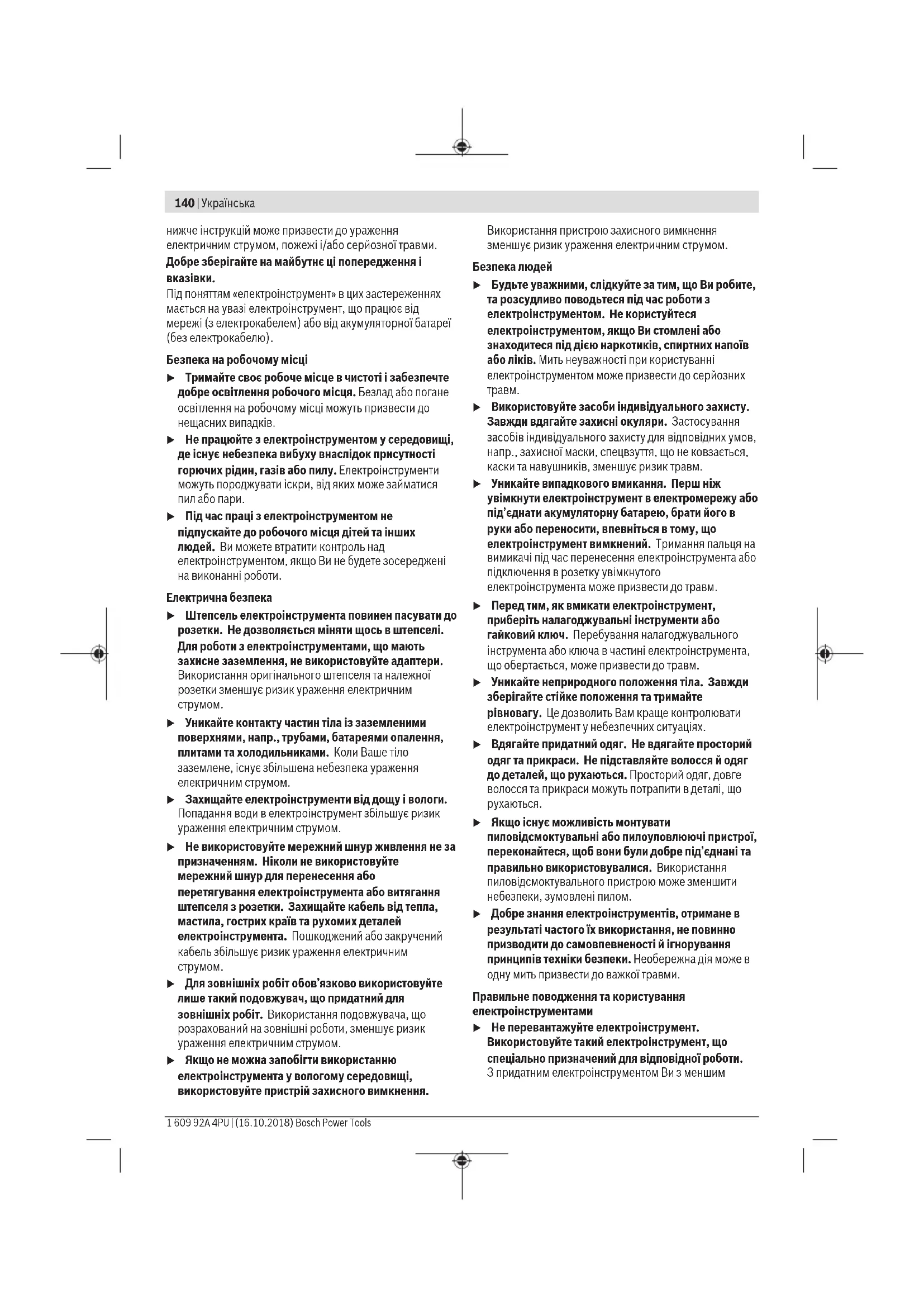 Прочитайте всі вказівки з техніки безпеки, інструкції, ілюстрації та специфікації, надані з цим електроінструментом. Невиконання усіх поданих Українська | 139 Bosch Power Tools 1 609 92A 4PU | (16.10.2018)140 | Українська 1 609 92A 4PU | (16.10.2018) Bosch Power Tools нижче інструкцій може призвести до ураження електричним струмом, пожежі і/або серйозної травми. Добре зберігайте на майбутнє ці попередження і