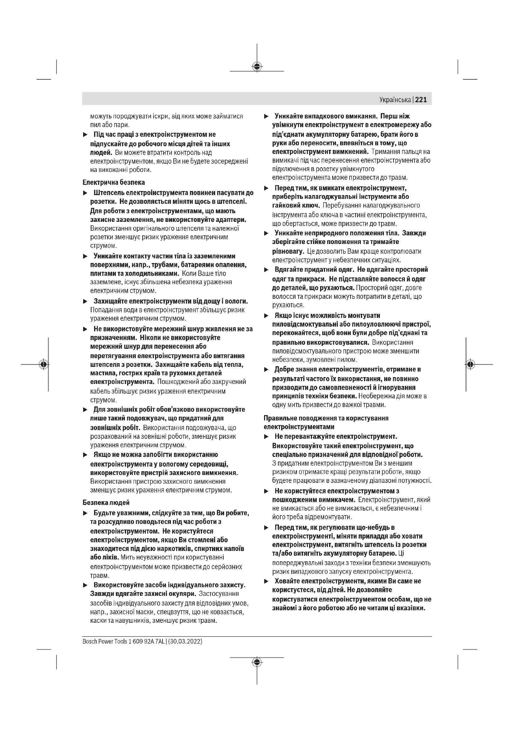 u Якщо існує можливість монтувати пиловідсмоктувальні або пилоуловлюючі пристрої, переконайтеся, щоб вони були добре під’єднані та правильно використовувалися. Використання пиловідсмоктувального пристрою може зменшити небезпеки, зумовлені пилом. u Добре знання електроінструментів, отримане в результаті частого їх використання, не повинно призводити до самовпевненості й ігнорування принципів техніки безпеки. Необережна дія може в одну мить призвести до важкої травми. Правильне поводження та користування електроінструментами u Не перевантажуйте електроінструмент. Використовуйте такий електроінструмент, що спеціально призначений для відповідної роботи. Зпридатним електроінструментом Ви з меншим ризиком отримаєте кращі результати роботи, якщо будете працювати в зазначеному діапазоні потужності. u Не користуйтеся електроінструментом з пошкодженим вимикачем. Електроінструмент, який не вмикається або не вимикається, є небезпечним і його треба відремонтувати. u Перед тим, як регулювати що-небудь в електроінструменті, міняти приладдя або ховати електроінструмент, витягніть штепсель із розетки та/або витягніть акумуляторну батарею. Ці попереджувальні заходи з техніки безпеки зменшують ризик випадкового запуску електроінструмента. u Ховайте електроінструменти, якими Ви саме не користуєтеся, від дітей. Не дозволяйте користуватися електроінструментом особам, що не знайомі з його роботою або не читали ці вказівки. Bosch Power Tools 1 609 92A 7AL | (30.03.2022)222 | Українська Використання електроінструментів недосвідченими особами може бути небезпечним. u Старанно доглядайте за електроінструментами і приладдям. Перевіряйте, щоб рухомі деталі електроінструмента були правильно розташовані та не заїдали, не були пошкодженими або у будь- якому іншому стані, який міг би вплинути на функціонування електроінструмента. Пошкоджені електроінструменти потрібно відремонтувати, перш ніж користуватися ними знову. Велика кількість нещасних випадків спричиняється поганим доглядом за електроінструментами. u Тримайте різальні інструменти нагостреними та в чистоті. Старанно доглянуті різальні інструменти з гострим різальним краєм менше застряють та легші в експлуатації. u Використовуйте електроінструмент, приладдя до нього, робочі інструменти тощо відповідно до цих вказівок. Беріть до уваги при цьому умови роботи та специфіку виконуваної роботи. Використання електроінструментів для робіт, для яких вони не передбачені, може призвести до небезпечних