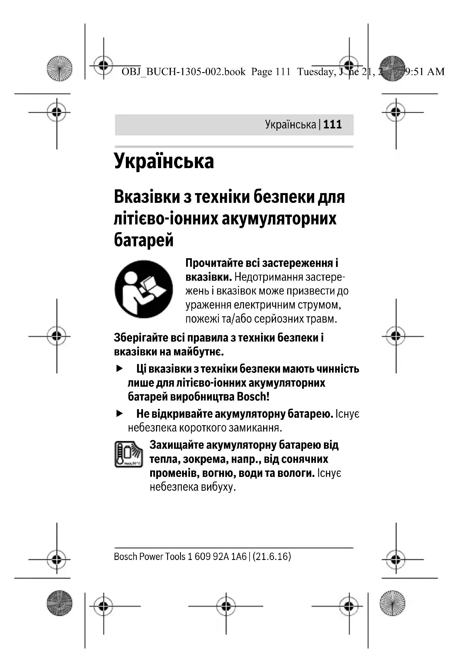 Прочитайте всі застереження і вказівки. Недотримання застере- жень і вказівок може призвести до ураження електричним струмом, пожежі та/або серйозних травм. Зберігайте всі правила з техніки безпеки і вказівки на майбутнє. Ці вказівки з техніки безпеки мають чинність лише для літієво-іонних акумуляторних батарей виробництва Bosch! Не відкривайте акумуляторну батарею. Існує небезпека короткого замикання. Захищайте акумуляторну батарею від тепла, зокрема, напр., від сонячних променів, вогню, води та вологи. Існує небезпека вибуху. OBJ_BUCH-1305-002.book Page 111 Tuesday, June 21, 2016 9:51 AM112 | Українська 1 609 92A 1A6 | (21.6.16) Bosch Power Tools Не зберігайте акумуляторну батарею, якою Ви саме не користуєтесь, поряд із канцелярськими скріпками, ключами, гвіздками, гвинтами та іншими невеликими металевими предметами, які можуть спричинити перемикання контактів. Коротке замикання між контактами акумуляторної батареї може спричиняти опіки або пожежу. При неправильному використанні з аку- муляторної батареї може потекти рідина. Уникайте контакту з нею. При випадковому контакті промийте відповідне місце водою. Якщо рідина потрапила в очі, додатково зверніться до лікаря. Акумуляторна рідина може спричиняти подразнення шкіри або опіки. При пошкодженні або неправильній експлуатації акумуляторної батареї може виходити пар. Впустіть свіже повітря і – у разі скарг – зверніться до лікаря. Пар може подразнювати дихальні шляхи. Заряджайте акумуляторні батареї лише в заряджувальних пристроях, рекомендованих виготовлювачем. Використання заряджувального пристрою для акумуляторних батарей, для яких він не передбачений, може призводити до пожежі. OBJ_BUCH-1305-002.book Page 112 Tuesday, June 21, 2016 9:51 AMУкраїнська | 113 Bosch Power Tools 1 609 92A 1A6 | (21.6.16) При несправній акумуляторній батареї може виступати рідина і забруднювати сусідні предмети. Перевірте зачеплені частини. Прочистіть їх або за необхідністю поміняйте. Використовуйте акумуляторну батарею лише з Вашим інструментом Bosch. Лише за таких умов акумуляторна батарея буде захищена від небезпечного перевантаження. Гострими предметами, як напр., гвіздками чи викрутками, а також зовнішніми силовими діями можна пошкодити акумуляторну батарею. Можливе внутрішнє коротке замикання, загоряння, утворення диму, вибух або перегрів акумуляторної