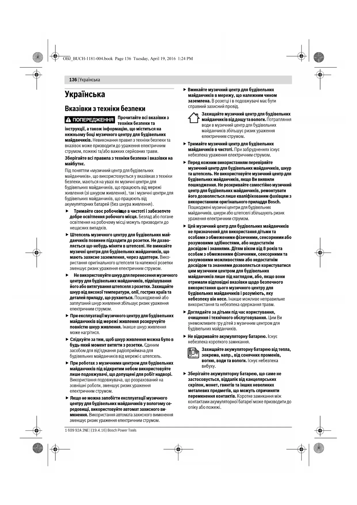 ів від дощу та вологи. Потрапляння води в музичний центр для будівельних майданчиків збільшує ризик ураження електричним струмом. Тримайте музичний центр для будівельних майданчиків в чистоті. При забрудненнях існує небезпека ураження електричним струмом. Перед кожним використанням перевіряйте музичний центр для будівельних майданчиків, шнур та штепсель. Не використовуйте музичний центр для будівельних майданчиків, якщо Ви виявили пошкодження. Не розкривайте самостійно музичний центр для будівельних майданчиків, ремонтувати його дозволяється лише кваліфікованим фахівцям з використанням оригінального приладдя Bosch. Пошкоджені музичні центри для будівельних майданчиків, шнури або штепселі збільшують ризик ураження електричним струмом. Цей музичний центр для будівельних майданчиків не призначений для використання дітьми та особами з обмеженими фізичними, сенсорними або розумовими здібностями, або недостатн