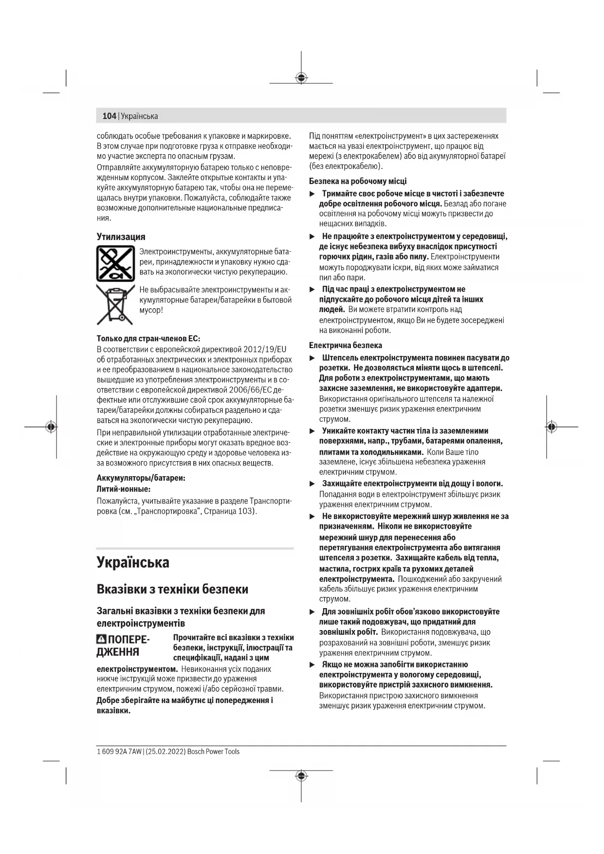 Лише для країнЄС: Відповідно до Європейської Директиви 2012/19/EU щодо відходів електричного та електронного обладнання та її перетворення в національне законодавство електроінструменти, які більше не придатні до використання, а також відповідно до Європейської Директиви 2006/66/EC несправні або відпрацьовані акумуляторні батареї/батарейки повинні здаватися окремо і утилізуватися екологічно чистим способом. При неправильній утилізації відпрацьовані електричні та електронні прилади можуть мати шкідливий вплив на навколишнє середовище та здоров’я людини через можливу наявність небезпечних речовин. Акумулятори/батарейки: Літієво-іонні: Будь ласка, зважайте на вказівки в розділі Транспортування (див. „Транспортування“, Сторінка110).