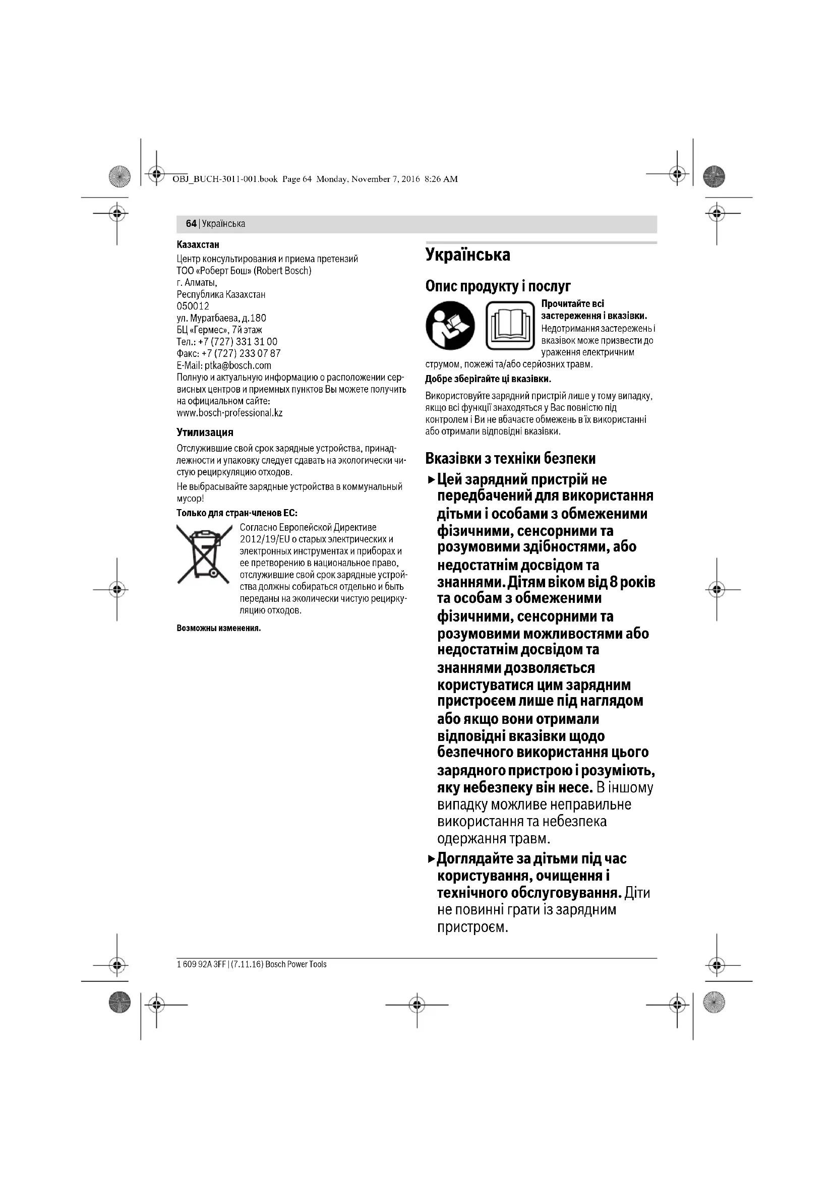 - Деякі зовнішні пристрої USB, хоча і мають відповідні технічні дані, все одно не заряджаються від цього зарядного пристрою. OBJ_BUCH-3011-001.book Page 67 Monday, November 7, 2016 8:26 AM68 | Қaзақша 1 609 92A 3FF | (7.11.16) Bosch Power Tools