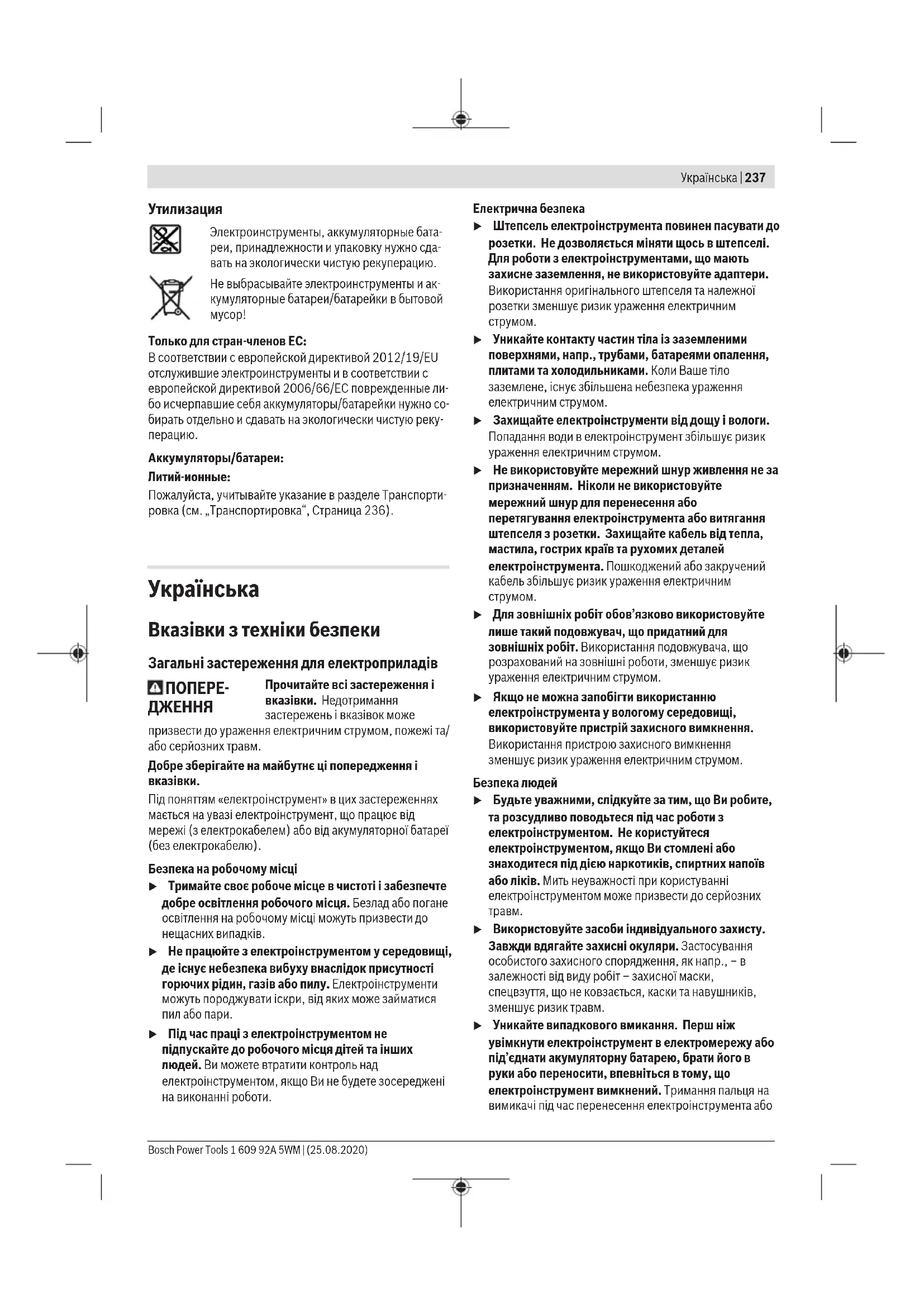 Лише для країнЄС: Відповідно до європейської директиви 2012/19/EU електроінструменти, що вийшли із вживання, та відповідно до європейської директиви 2006/66/EC пошкоджені або відпрацьовані акумуляторні батареї/ батарейки повинні здаватися окремо і утилізуватися екологічно чистим способом. Акумулятори/батарейки: Літієво-іонні: Будь ласка, зважайте на вказівки в розділі Транспортування (див. „Транспортування“, Сторінка250).