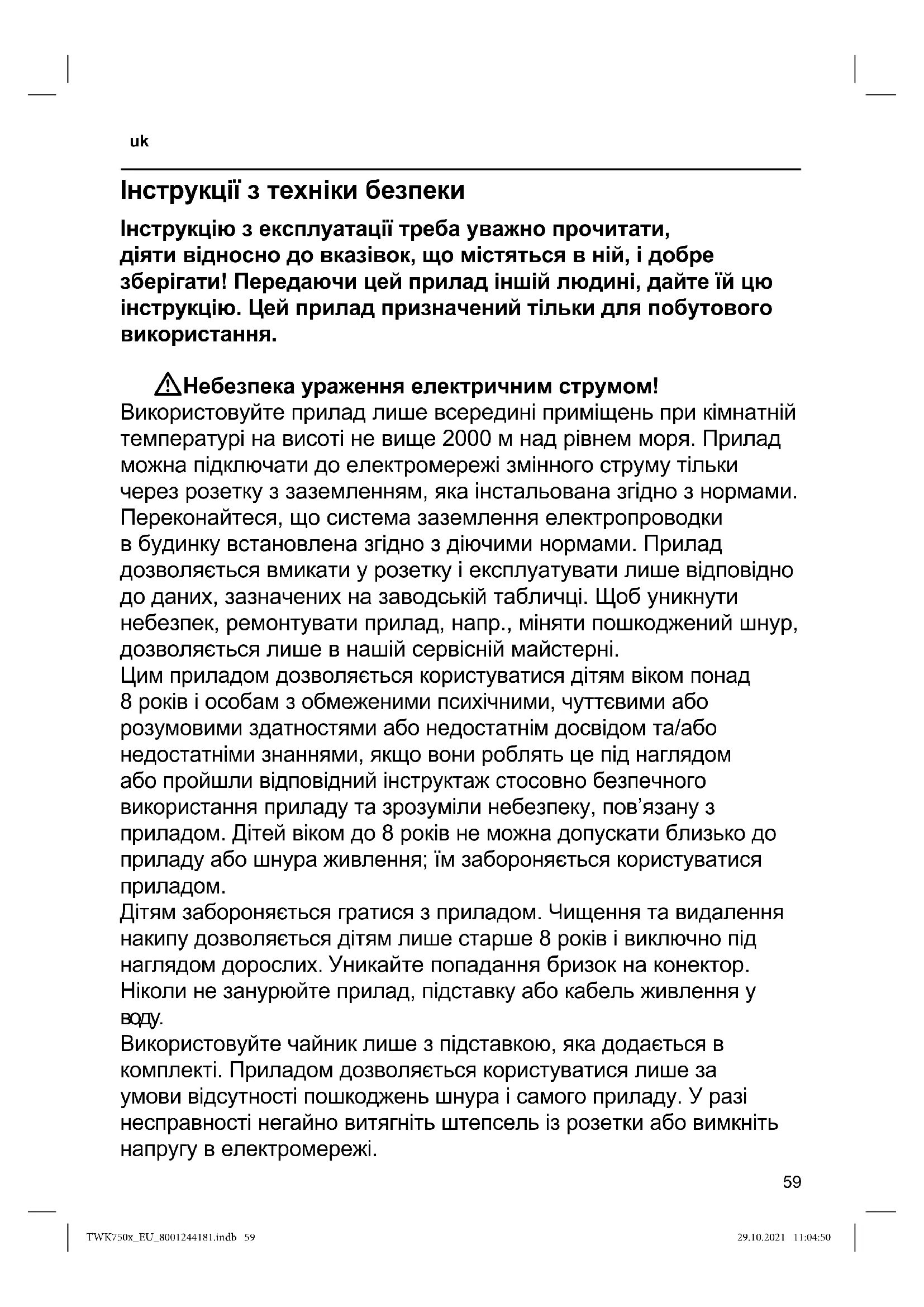 tym celu oraz w celu skorzystania z uprawnień z gwarancji prosimy o kontakt z infolinią: +48 42 271 5555 (opłata wg. stawek operatora). Zmiany zastrzeżone. TWK750x_EU_8001244181.indb 58TWK750x_EU_8001244181.indb 58 29.10.2021 11:04:5029.10.2021 11:04:50Інструкції з техніки безпеки Інструкцію з експлуатації треба уважно прочитати, діяти відносно до вказівок, що містяться в ній, і добре зберігати! Передаючи цей прилад іншій людині, дайте їй цю інструкцію. Цей прилад призначений тільки для побутового використання. W Небезпека ураження електричним струмом! Використовуйте прилад лише всередині приміщень при кімнатній температурі на висоті не вище 2000 м над рівнем моря. Прилад можна підключати до електромережі змінного струму тільки через розетку з заземленням, яка інстальована згідно з нормами. Пepeкoнaйтecя, щo cиcтeмa зaзeмлeння eлeктpoпpoвoдки в бyдинкy встановлена згiднo з дiючими нормами. Прилад дозволяється вмикати у розетку і експлуатувати лише відповідно до даних, зазначених на заводській табличці. Щоб уникнути небезпек, ремонтувати прилад, напр., міняти пошкоджений шнур, дозволяється лише в нашій сервісній майстерні. Цим приладом дозволяється користуватися дітям віком понад 8 років і особам з обмеженими психічними, чуттєвими або розумовими здатностями або недостатнім досвідом та/або недостатніми знаннями, якщо вони роблять це під наглядом або пройшли відповідний інструктаж стосовно безпечного використання приладу та зрозуміли небезпеку, пов’язану з приладом. Дітей віком до 8 років не можна допускати близько до приладу або шнура живлення; їм забороняється користуватися