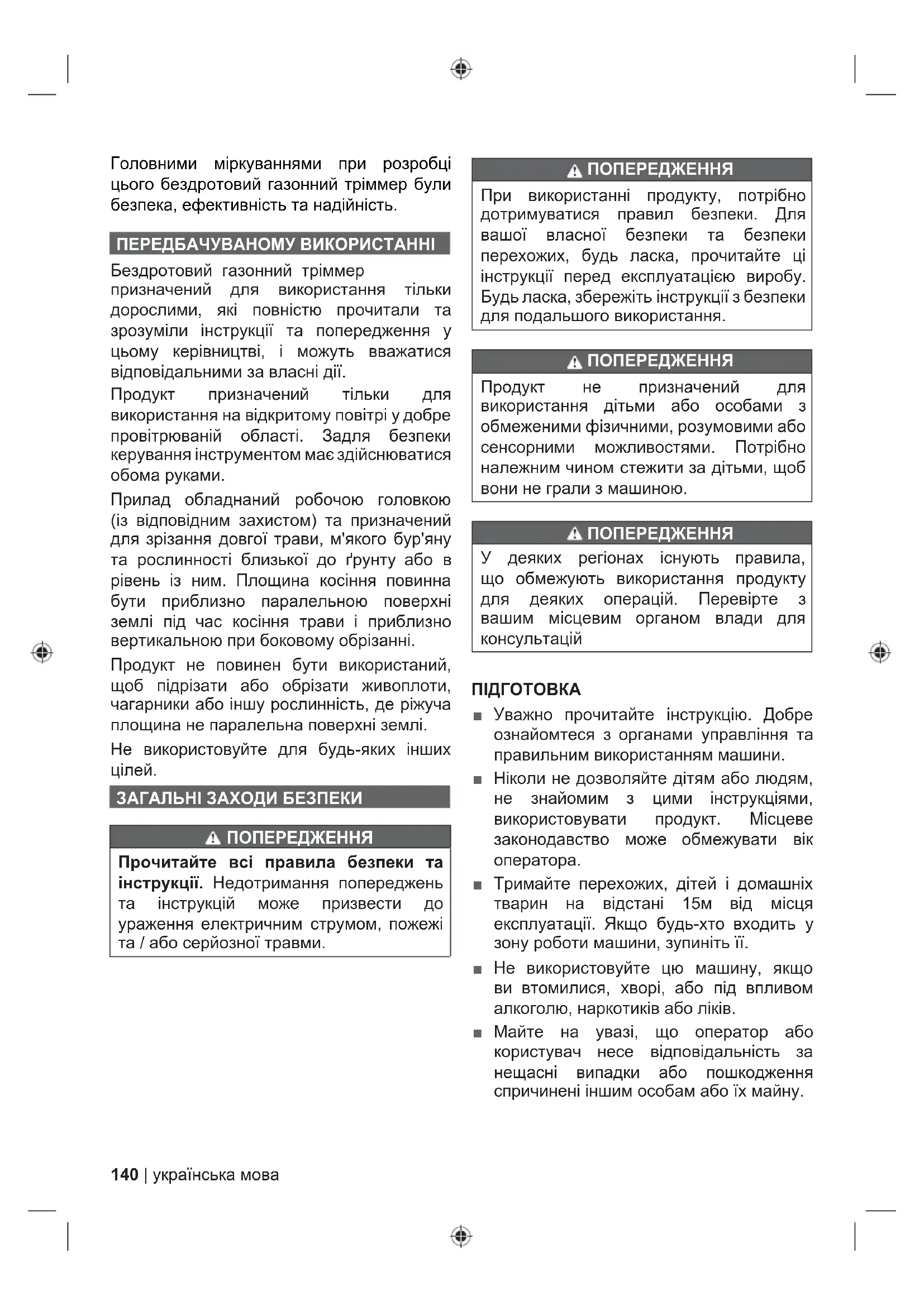 Предупреждение140 | українська мова Головними міркуваннями при розробці цього бездротовий газонний тріммер були безпека, ефективність та надійність. ПЕРЕДБАЧУВАНОМУ ВИКОРИСТАННІ Бездротовий газонний тріммер призначений для використання тільки дорослими, які повністю прочитали та зрозуміли інструкції та попередження у цьому керівництві, і можуть вважатися відповідальними за власні дії. Продукт призначений тільки для використання на відкритому повітрі у добре провітрюваній області. Задля безпеки керування інструментом має здійснюватися обома руками. Прилад обладнаний робочою головкою (із відповідним захистом) та призначений для зрізання довгої трави, м'якого бур'яну та рослинності близької до ґрунту або в рівень із ним. Площина косіння повинна бути приблизно паралельною поверхні землі під час косіння трави і приблизно вертикальною при боковому обрізанні. Продукт не повинен бути використаний, щоб підрізати або обрізати живоплоти, чагарники або іншу рослинність, де ріжуча площина не паралельна поверхні землі. Не використовуйте для будь-яких інших