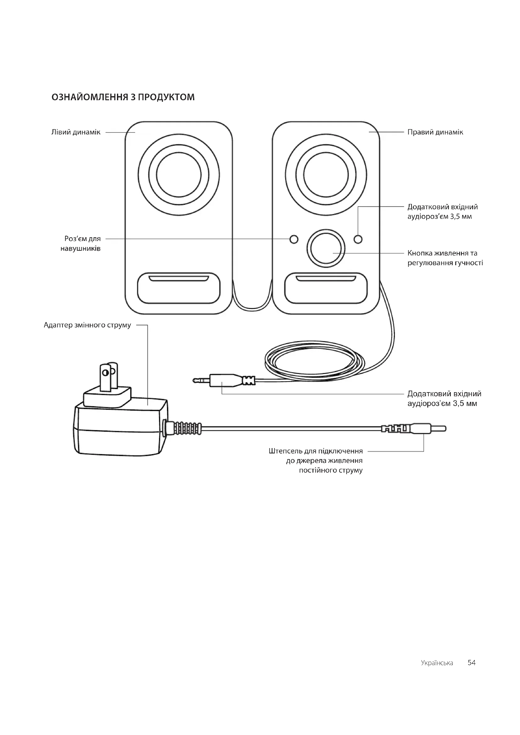 Штепсель для підключення до джерела живлення постійного струму Правий динамік Кнопка живленнята регулювання гучності Додатковий вхідний аудіороз’єм 3,5 мм Додатковий вхідний аудіороз’єм 3,5мм Адаптер змінного струмуУкраїнська 55 ПІДКЛЮЧЕННЯ ДИНАМІКІВ