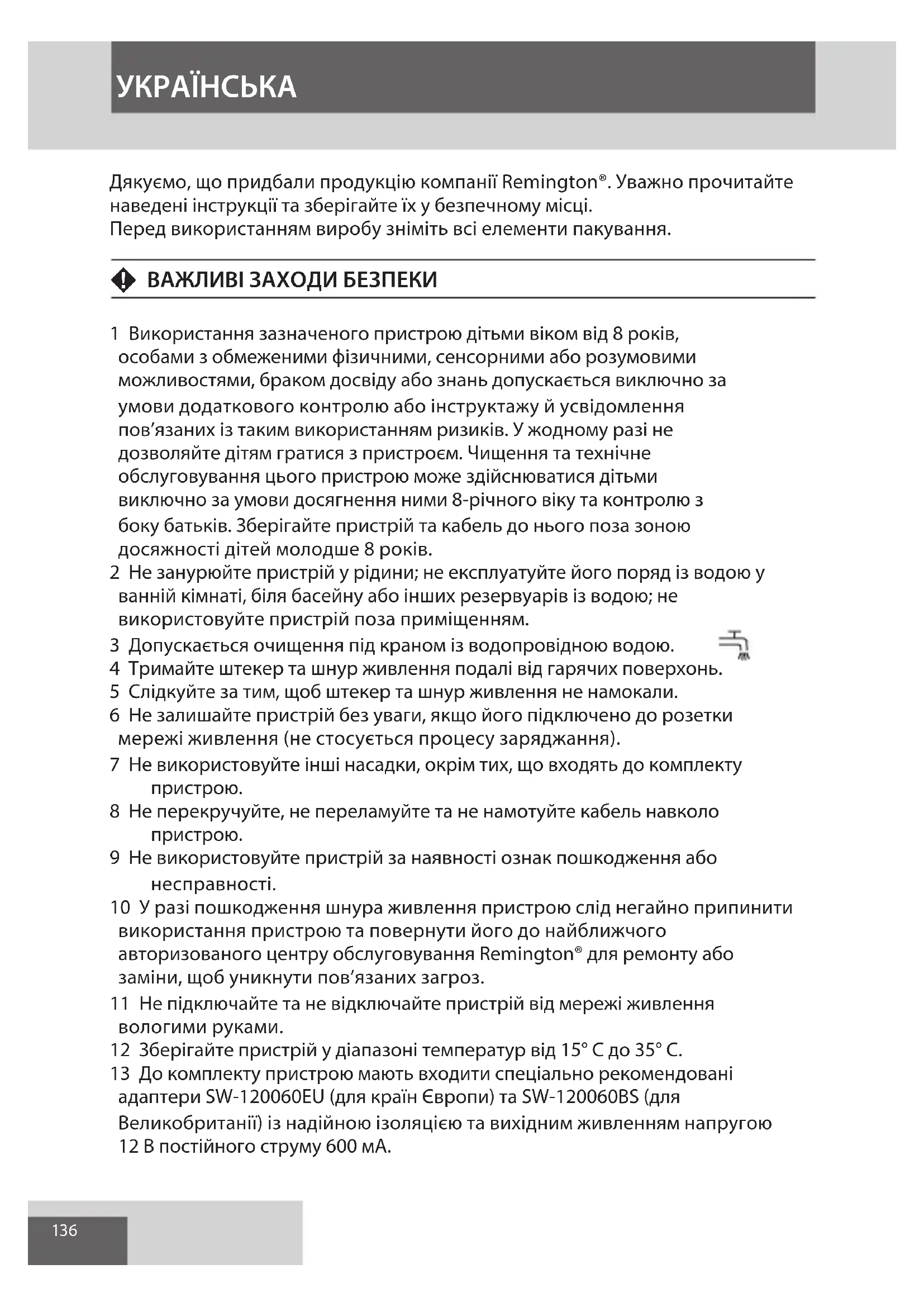 Дякуємо, що придбали продукцію компанії Remington®. Уважно прочитайте наведені інструкції та зберігайте їх у безпечному місці.
