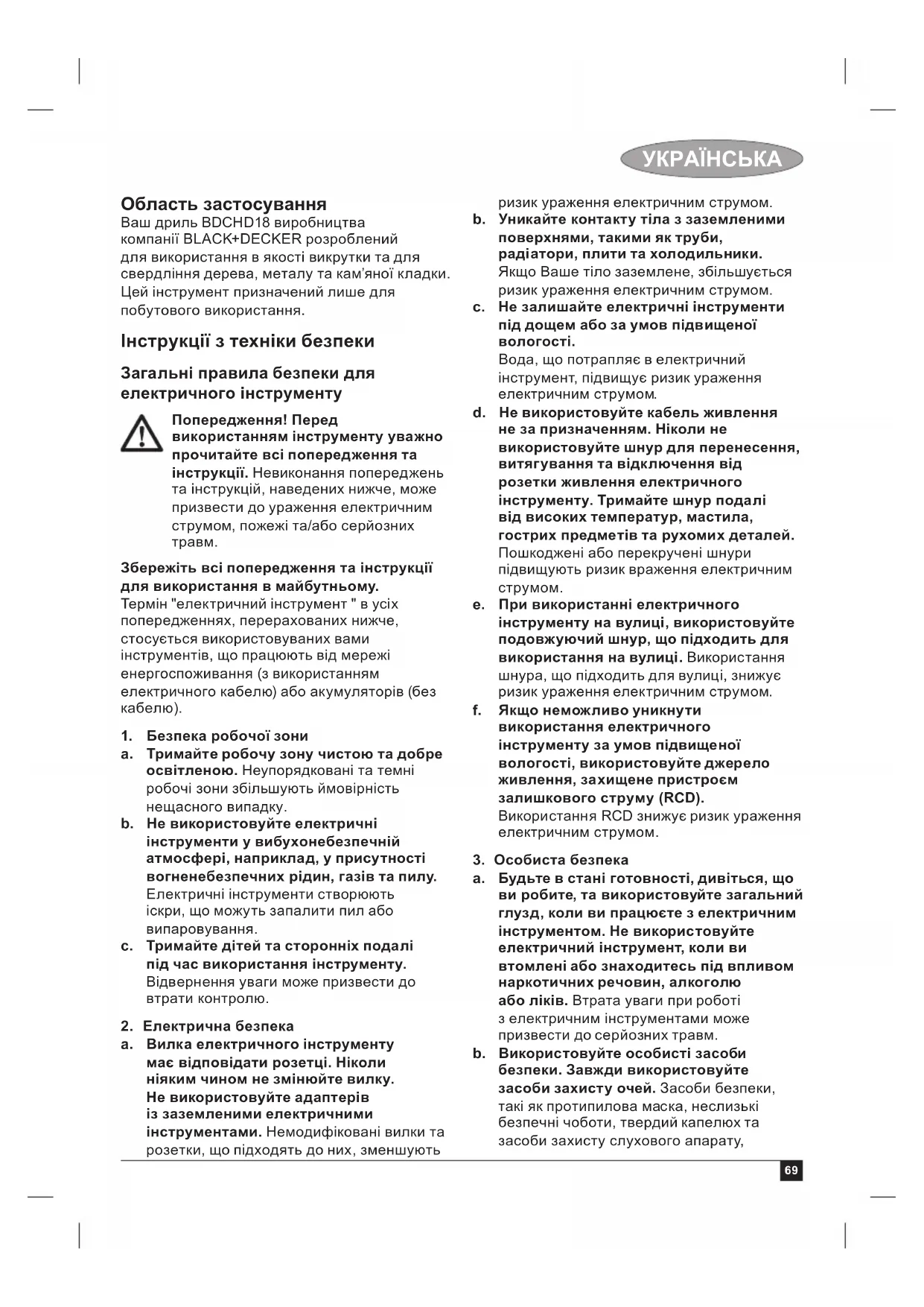 Область застосування Ваш дриль BDCHD18 виробництва компанії BLACK+DECKER розроблений для використання в якості викрутки та для свердління дерева, металу та кам’яної кладки. Цей інструмент призначений лише для побутового використання. Інструкції з техніки безпеки Загальні правила безпеки для електричного інструменту Попередження! Перед використанням інструменту уважно прочитайте всі попередження та інструкції. Невиконання попереджень та інструкцій, наведених нижче, може призвести до ураження електричним струмом, пожежі та/або серйозних