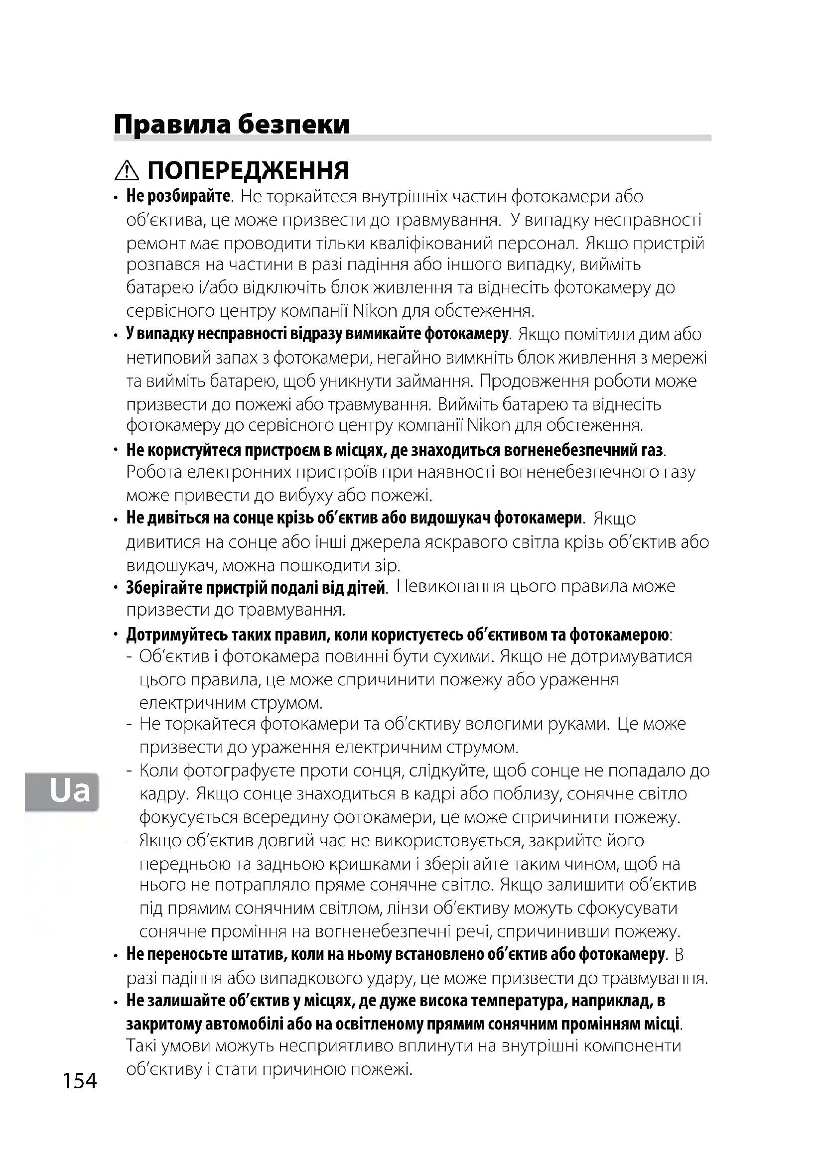 Правила безпеки ПОПЕРЕДЖЕННЯ Не розбирайте. Не торкайтеся внутрішніх частин фотокамери або об’єктива, це може призвести до травмування. У випадку несправності ремонт має проводити тільки кваліфікований персонал. Якщо пристрій розпався на частини в разі падіння або іншого випадку, вийміть батарею і/або відключіть блок живлення та віднесіть фотокамеру до сервісного центру компанії Nikon для обстеження. У випадку несправності відразу вимикайте фотокамеру. Якщо помітили дим або нетиповий запах з фотокамери, негайно вимкніть блок живлення з мережі та вийміть батарею, щоб уникнути займання. Продовження роботи може призвести до пожежі або травмування. Вийміть батарею та віднесіть фотокамеру до сервісного центру компанії Nikon для обстеження. Не користуйтеся пристроєм в місцях, де знаходиться вогненебезпечний газ. Робота електронних пристроїв при наявності вогненебезпечного газу може привести до вибуху або пожежі. Не дивіться на сонце крізь об’єктив або видошукач фотокамери.