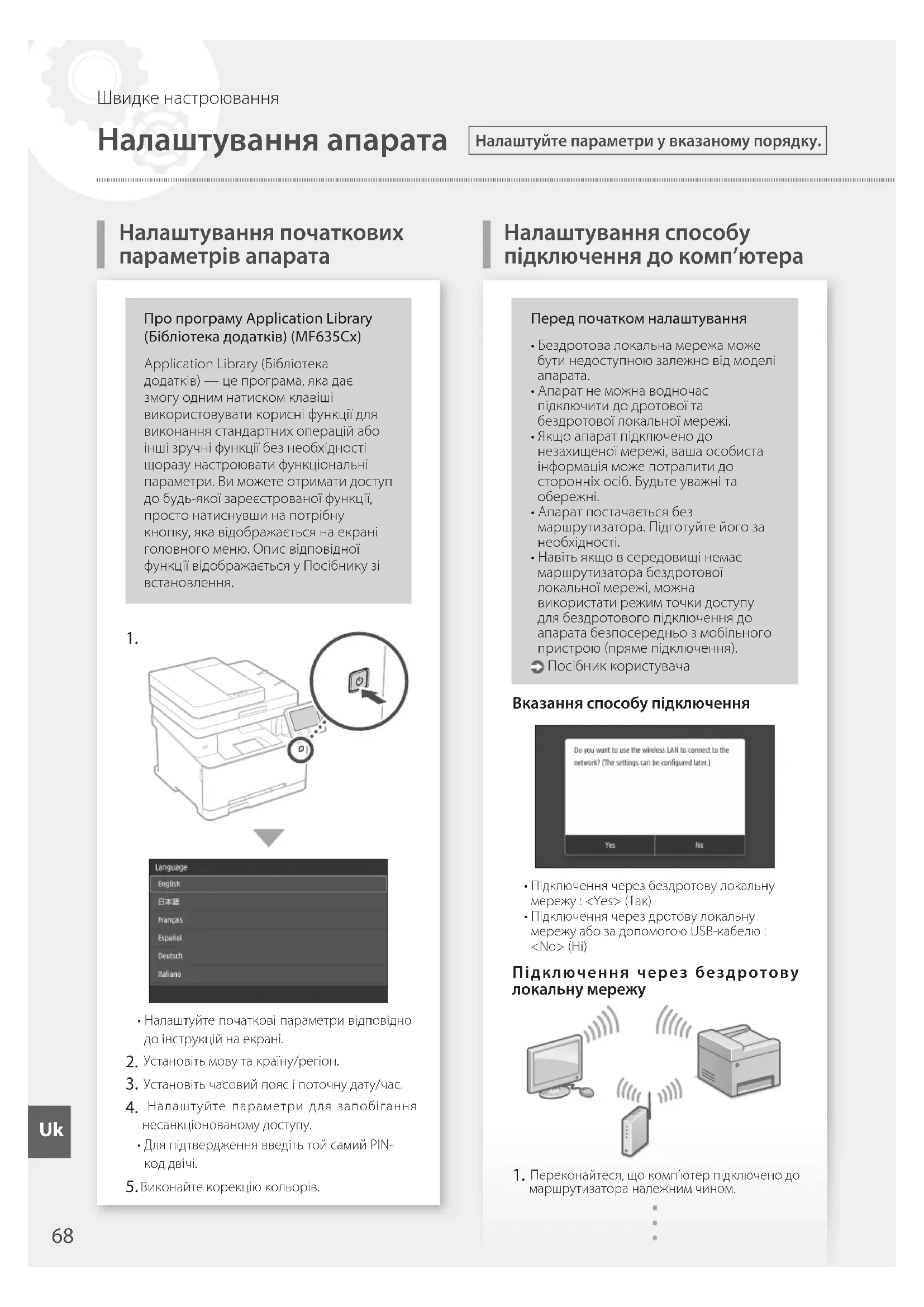 Налаштування апарата Налаштування початкових параметрів апарата Налаштуйте параметри у вказаному порядку. Швидке настроювання UkUkДодаткову інформацію див. в розділі «Настроювання за допомогою Посібника з настроювання» у Посібнику користувача Перевірте параметри мережі на комп’ютері. Запишіть SSID та ключ мережі.• Перевірте етикетку на маршрутизаторі. Посібник користувача• Процедура настроювання буде простішою, якщо на маршрутизаторі є позначка WPS. Посібник користувача Налаштуйте точку доступу та ключ мережі відповідно до інструкцій на екрані, наведених нижче.1. Натисніть кнопку <OK>.2. Натисніть кнопку <SSID Settings> (Параметри SSID).3. Натисніть кнопку <Select Access Point> (Вибір точки доступу).4. Виберіть точку доступу (SSID) і натисніть <Next> (Далі).5. Введіть ключ WEP (ключ мережі) і натисніть <Apply> (Застосувати).6. Натисніть кнопку <Yes> (Так).• IP-адреса буде автоматично налаштована через кілька хвилин.• Відображається повідомлення «Connected.» (Підключено).