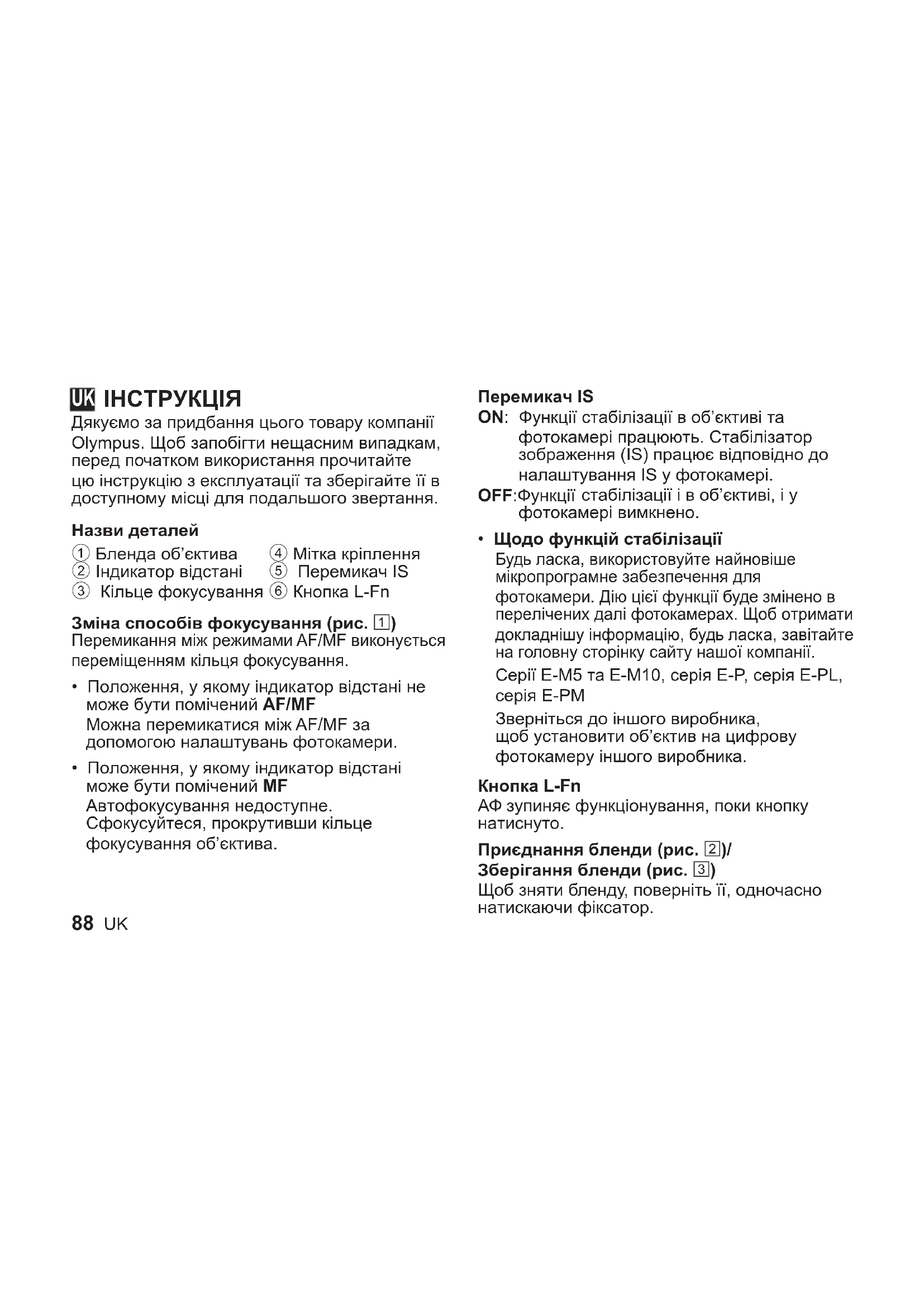 - Щодо функцій стабілізації Будь ласка, використовуйте найновіше мікропрограмне забезпечення для фотокамери. Дію цієї функції буде змінено в перелічених далі фотокамерах. Щоб отримати докладнішу інформацію, будь ласка, завітайте на головну сторінку сайту нашої компанії. Серії E-M5 та E-M10, серія E-P, серія E-PL, серія E-PM Зверніться до іншого виробника, щоб установити об’єктив на цифрову фотокамеру іншого виробника. Кнопка L-Fn АФ зупиняє функціонування, поки кнопку