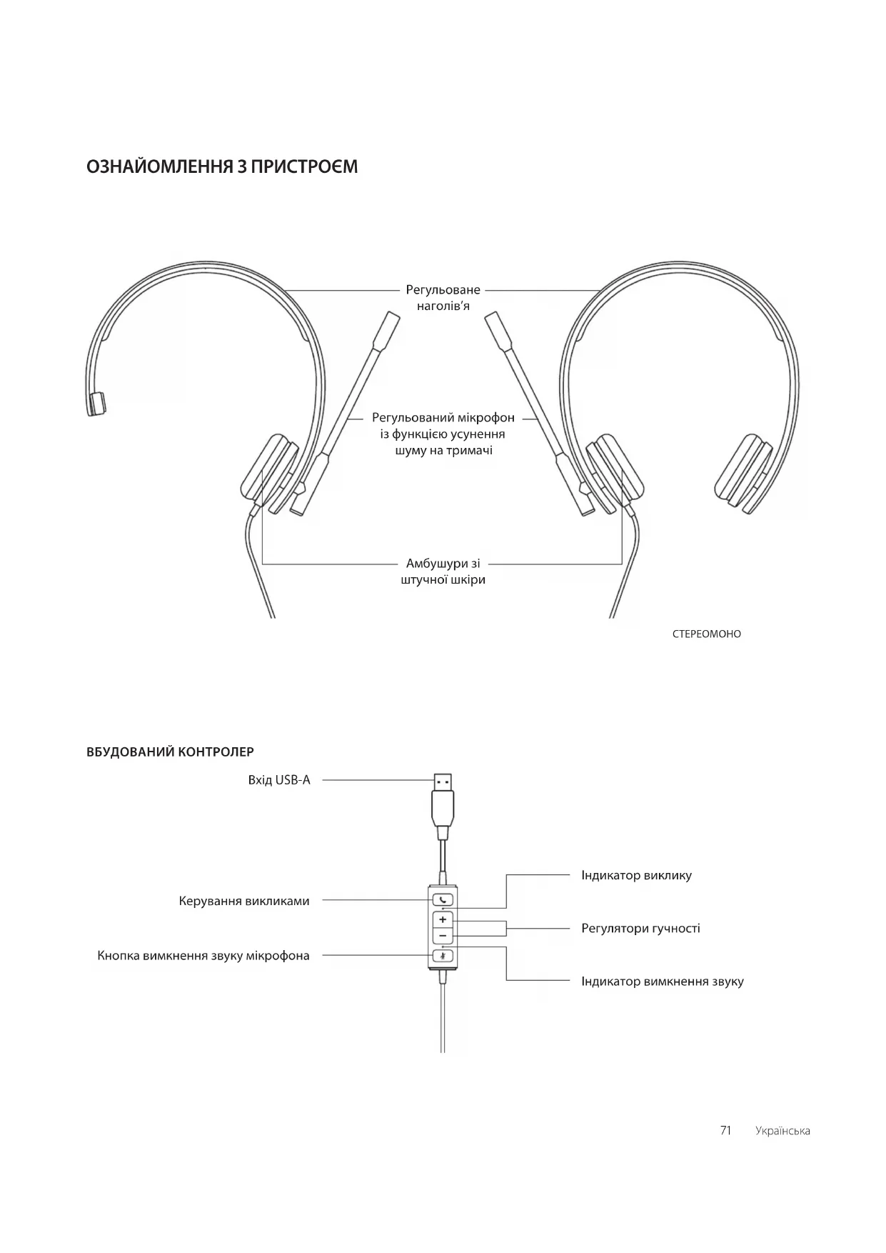 Вхід USB-A Керування викликами Кнопка вимкнення звуку мікрофона Регульований мікрофон із функцією усунення шуму на тримачі Амбушури зі штучної шкіри
