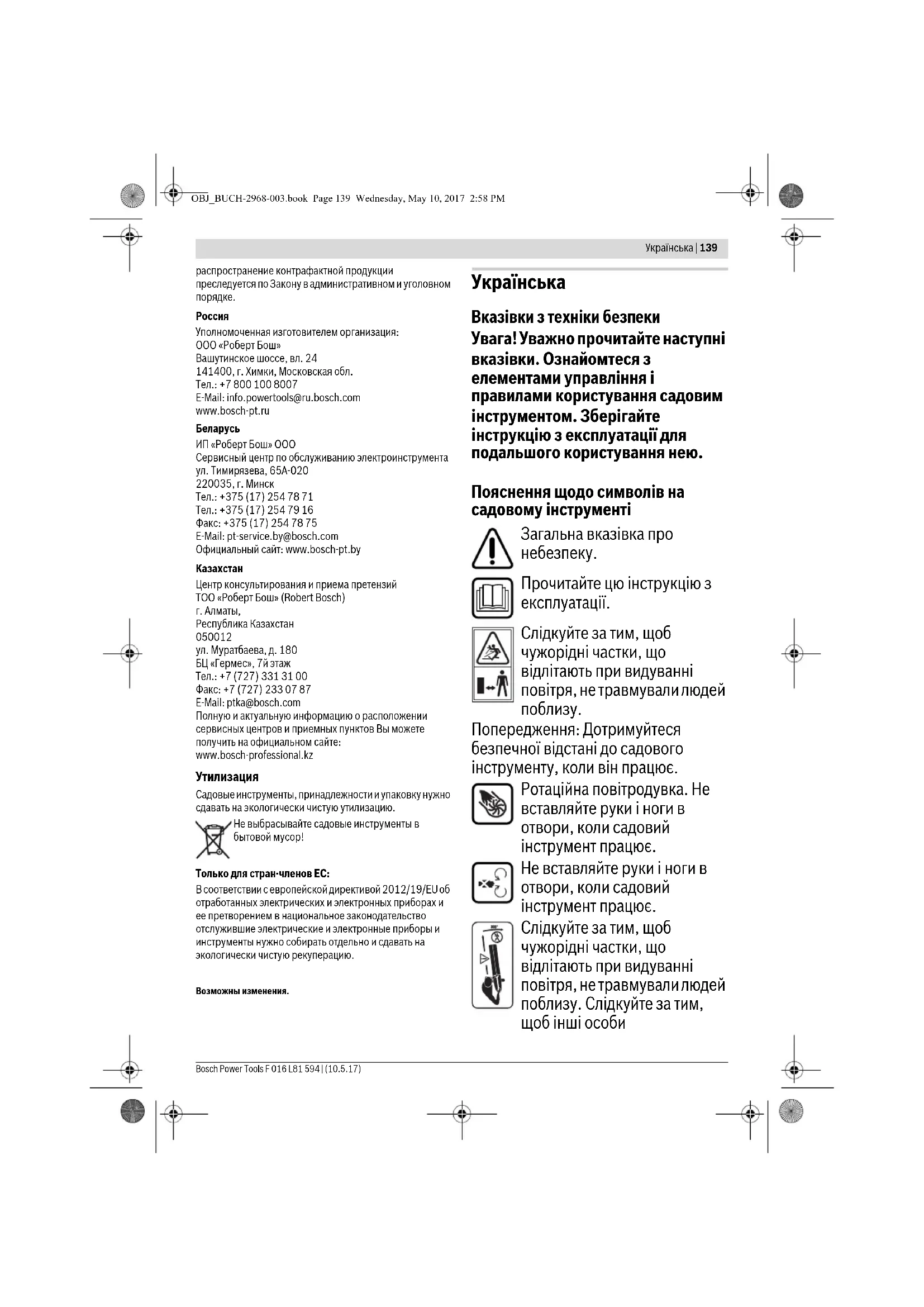 OBJ_BUCH-2968-003.book Page 140 Wednesday, May 10, 2017 2:58 PMУкраїнська | 141 Bosch Power Tools F 016 L81 594 | (10.5.17) Під час використання цього садового інструменту завжди закривайте верхню частину тулуба і руки міцною одежею. Не працюйте з садовими інструментом босоніж або у відкритих сандалях. Завжди майте на собі міцне взуття і довгі штани. Слідкуйте за тим, щоб просторий одяг не потрапив в систему подачі повітря, оскільки це може призвести до поранень. Використовуйте садовий інструмент лише з монтованим соплом або з монтованою всмоктувальною трубою. Слідкуйте за тим, щоб довге волосся не потрапило в систему подачі повітря, оскільки це може призвести до поранень. Ретельно огляньте місце, на якому Ви будете збирати листя, та приберіть дроти та інші чужорідні