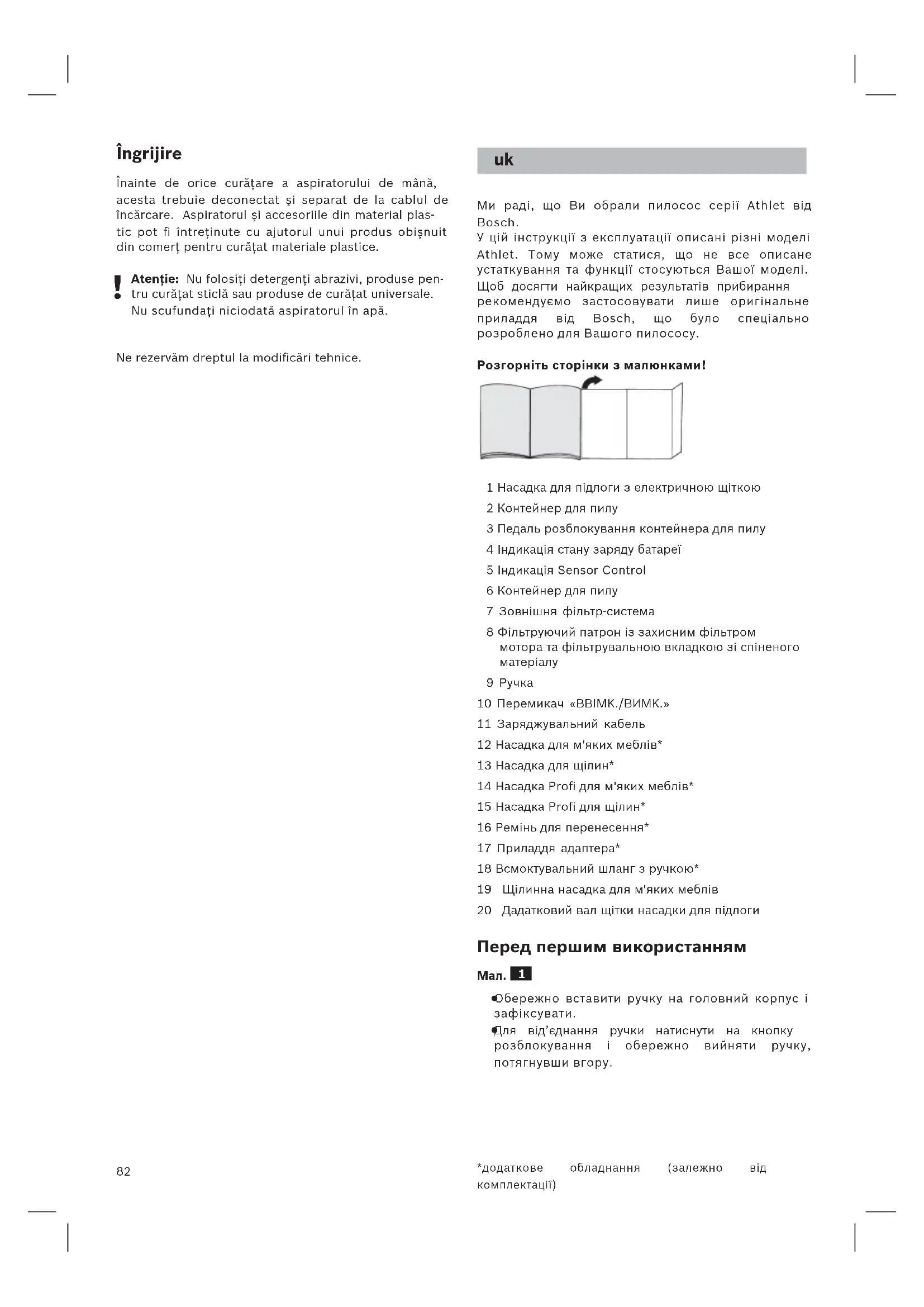 Ми раді, що Ви обрали пилосос серії Athlet від Bosch. У цій інструкції з експлуатації описані різні моделі Athlet. Тому може статися, що не все описане устаткування та функції стосуються Вашої моделі. Щоб досягти найкращих результатів прибирання рекомендуємо застосовувати лише оригінальне приладдя від Bosch, що було спеціально розроблено для Вашого пилососу. Розгорніть сторінки з малюнками! 1 Насадка для підлоги з електричною щіткою 2 Контейнер для пилу 3 Педаль розблокування контейнера для пилу 4 Індикація стану заряду батареї 5 Індикація Sensor Control 6 Контейнер для пилу 7 Зовнішня фільтр-система 8 Фільтруючий патрон iз захисним фільтром мотора та фільтрувальною вкладкою зі спіненого