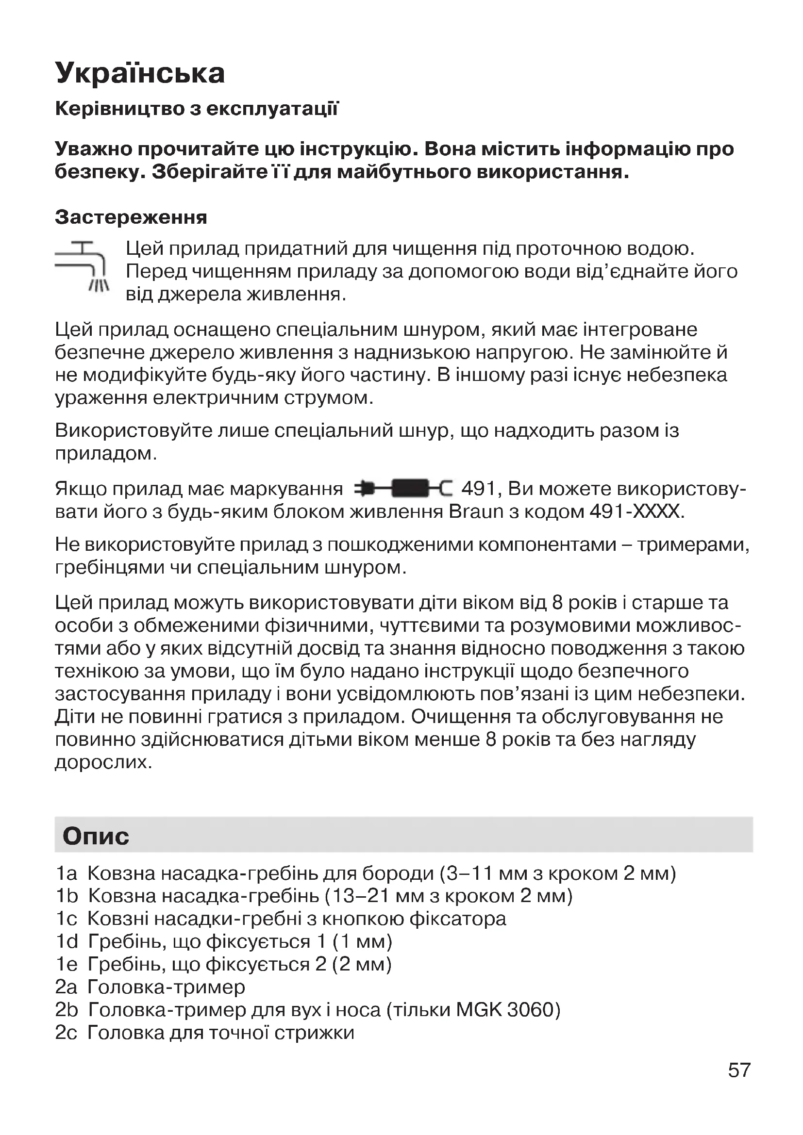 Якщо прилад має маркування 491, Ви можете використову- вати його з будь-яким блоком живлення Braun з кодом 491-ХХХХ. Не використовуйте прилад з пошкодженими компонентами – тримерами, гребінцями чи спеціальним шнуром. Цей прилад можуть використовувати діти віком від 8 років і старше та особи з обмеженими фізичними, чуттєвими та розумовими можливос- тями або у яких відсутній досвід та знання відносно поводження з такою технікою за умови, що їм було надано інструкції щодо безпечного застосування приладу і вони усвідомлюють пов’язані із цим небезпеки. Діти не повинні гратися з приладом. Очищення та обслуговування не повинно здійснюватися дітьми віком менше 8 років та без нагляду