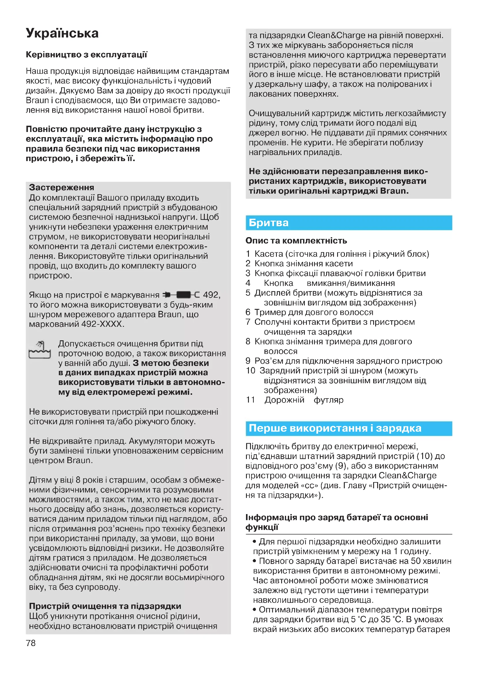 Якщо на пристрої є маркування 492, то його можна використовувати з будь-яким шнуром мережевого адаптера Braun, що маркований 492-ХХХХ. Допускається очищення бритви під проточною водою, а також використання у ванній або душі. З метою безпеки в даних випадках пристрій можна використовувати тільки в автономно- му від електромережі режимі. Не використовувати пристрій при пошкодженні сіточки для гоління та/або ріжучого блоку. Не відкривайте прилад. Акумулятори можуть бути замінені тільки уповноваженим сервісним центром Braun. Дітям у віці 8 років і старшим, особам з обмеже- ними фізичними, сенсорними та розумовими можливостями, а також тим, хто не має достат- нього досвіду або знань, дозволяється користу- ватися даним приладом тільки під наглядом, або після отримання роз’яснень про техніку безпеки при використанні приладу, за умови, що вони усвідомлюють відповідні ризики. Не дозволяйте дітям гратися з приладом. Не дозволяється здійснювати очисні та профілактичні роботи обладнання дітям, які не досягли восьмирічного віку, та без супроводу. Пристрій очищення та підзарядки Щоб уникнути протікання очисної рідини, необхідно встановлювати пристрій очищення та підзарядки Clean&Charge на рівній поверхні. З тих же міркувань забороняється після встановлення миючого картриджа перевертати пристрій, різко пересувати або переміщувати його в інше місце. Не встановлювати пристрій у дзеркальну шафу, а також на полірованих і лакованих поверхнях. Очищувальний картридж містить легкозаймисту рідину, тому слід тримати його подалі від джерел вогню. Не піддавати дії прямих сонячних променів. Не курити. Не зберігати поблизу нагрівальних приладів. Не здійснювати перезаправлення вико- ристаних картриджів, використовувати тільки оригінальні картриджі Braun.