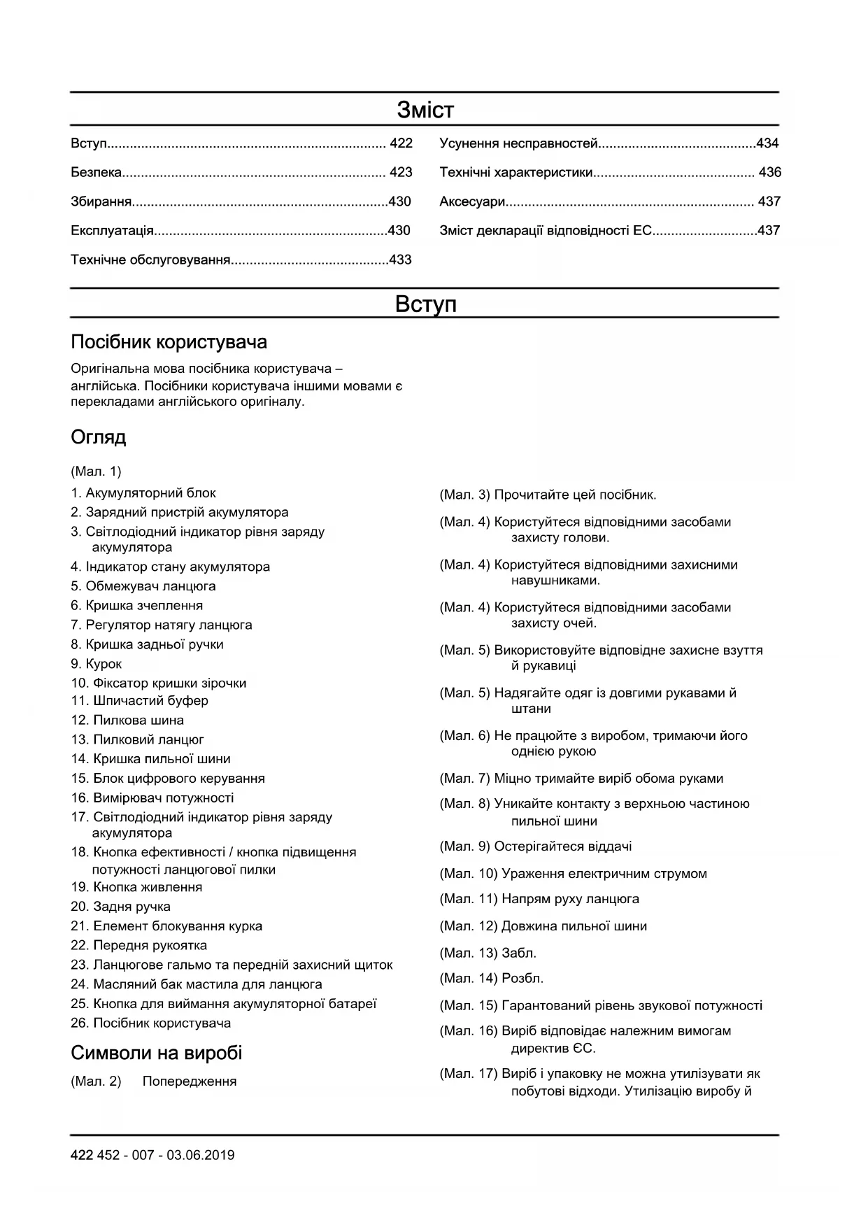 (Мал. 6) Не працюйте з виробом, тримаючи його однією рукою (Мал. 7) Міцно тримайте виріб обома руками (Мал. 8) Уникайте контакту з верхньою частиною пильної шини (Мал. 9) Остерігайтеся віддачі (Мал. 10) Ураження електричним струмом (Мал. 11) Напрям руху ланцюга (Мал. 12) Довжина пильної шини (Мал. 13) Забл. (Мал. 14) Розбл. (Мал. 15) Гарантований рівень звукової потужності (Мал. 16) Виріб відповідає належним вимогам директив ЄС. (Мал. 17) Виріб і упаковку не можна утилізувати як побутові відходи. Утилізацію виробу й 422 452 - 007 - 03.06.2019упаковки слід здійснювати на спеціалізованому підприємстві з переробки відходів електричного й електронного обладнання. (Мал. 18) Не залишайте, не зберігайте й не використовуйте виріб під дощем і у вологому середовищі. (Мал. 19) Утилізація Зверніть увагу: Інші позначення на виробі відповідають вимогам спеціальних сертифікатів для інших торгових зон. Відповідальність за якість продукції Згідно із законом про відповідальність за якість продукції ми не несемо відповідальності за будь-які пошкодження, спричинені роботою наших виробів,
