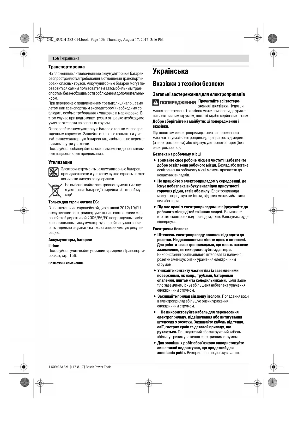 несуть в собі небезпеку. Старанно доглядайте за електроприладом. Перевіряйте, щоб рухомі деталі приладу бездоганно працювали та не заїдали, не були пошкодженими або настільки пошкодженими, щоб це могло вплинути на функціонування електроприладу. Пошкоджені деталі треба відремонтувати, перш ніж користуватися ними знов. Велика кількість нещасних випадків спричиняється поганим доглядом за електроприладами. Тримайте різальні інструменти нагостреними та в чистоті. Старанно доглянуті різальні інструменти з гострим різальним краєм менше застряють та легші в експлуатації. Використовуйте електроприлад, приладдя до нього, робочі інструменти т.і. відповідно до цих вказівок. Беріть до уваги при цьому умови роботи та спе- цифіку виконуваної роботи. Використання електроприладів для робіт, для яких вони не передбачені, може призвести до небезпечних ситуацій. Правильне поводження та користування приладами, що працюють на акумуляторних батареях Заряджайте акумуляторні батареї лише в заряджувальних пристроях, рекомендованих виготовлювачем. Використання заряджувального пристрою для акумуляторних батарей, для яких він не передбачений, може призводити до пожежі. Використовуйте в електроприладах лише рекомендовані акумуляторні батареї. Використання інших акумуляторних батарей може призводити до травм та пожежі. Не зберігайте акумуляторну батарею, якою Ви саме не користуєтесь, поряд із канцелярськими скріпками, ключами, гвіздками, гвинтами та іншими невеликими металевими предметами, які можуть спричинити перемикання контактів. Коротке замикання між контактами акумуляторної батареї може спричиняти опіки або пожежу. При неправильному використанні з акумуляторної батареї може потекти рідина. Уникайте контакту з нею. При випадковому контакті промийте відпо- відне місце водою. Якщо рідина потрапила в очі, OBJ_BUCH-283-014.book Page 157 Thursday, August 17, 2017 3:16 PM158 | Українська 1 609 92A 3XU | (17.8.17) Bosch Power Tools додатково зверніться до лікаря. Акумуляторна рідина може спричиняти подразнення шкіри або опіки.
