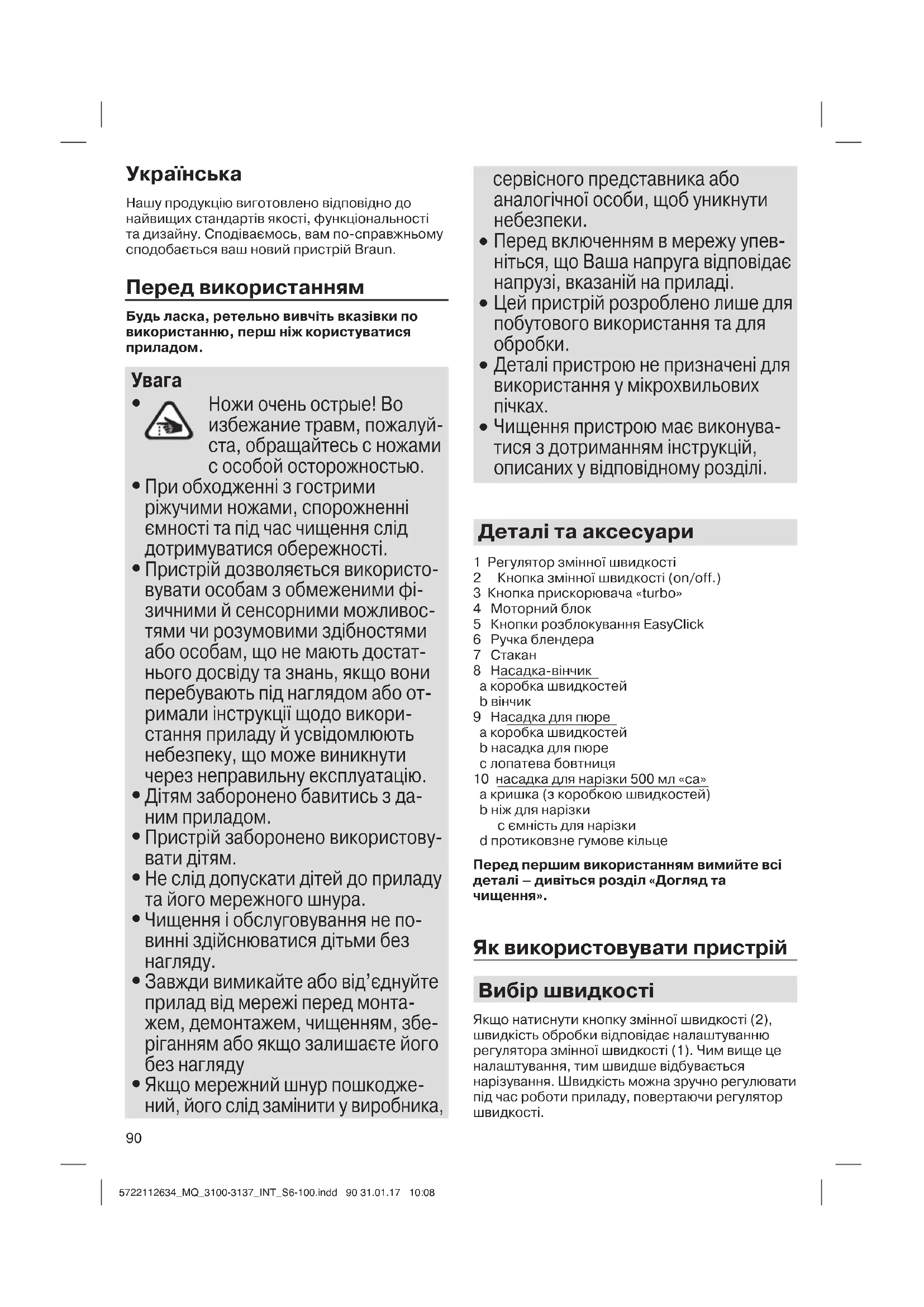 5722112634_MQ_3100-3137_INT_S6-100.indd 90 31.01.17 10:0891 Максимальної швидкості обробки можна досягти шляхом натискання кнопки «turbo» (3). Кнопку «turbo» також можна використовувати для миттєвих потужних імпульсів замість того, щоб перемикати регулятор швидкості. Насадка-блендер (А) Ручний блендер ідеально пасує для приготування підлив, соусів, приправ до салатів, супів, дитячого харчування, а також напоїв, молочних та інших