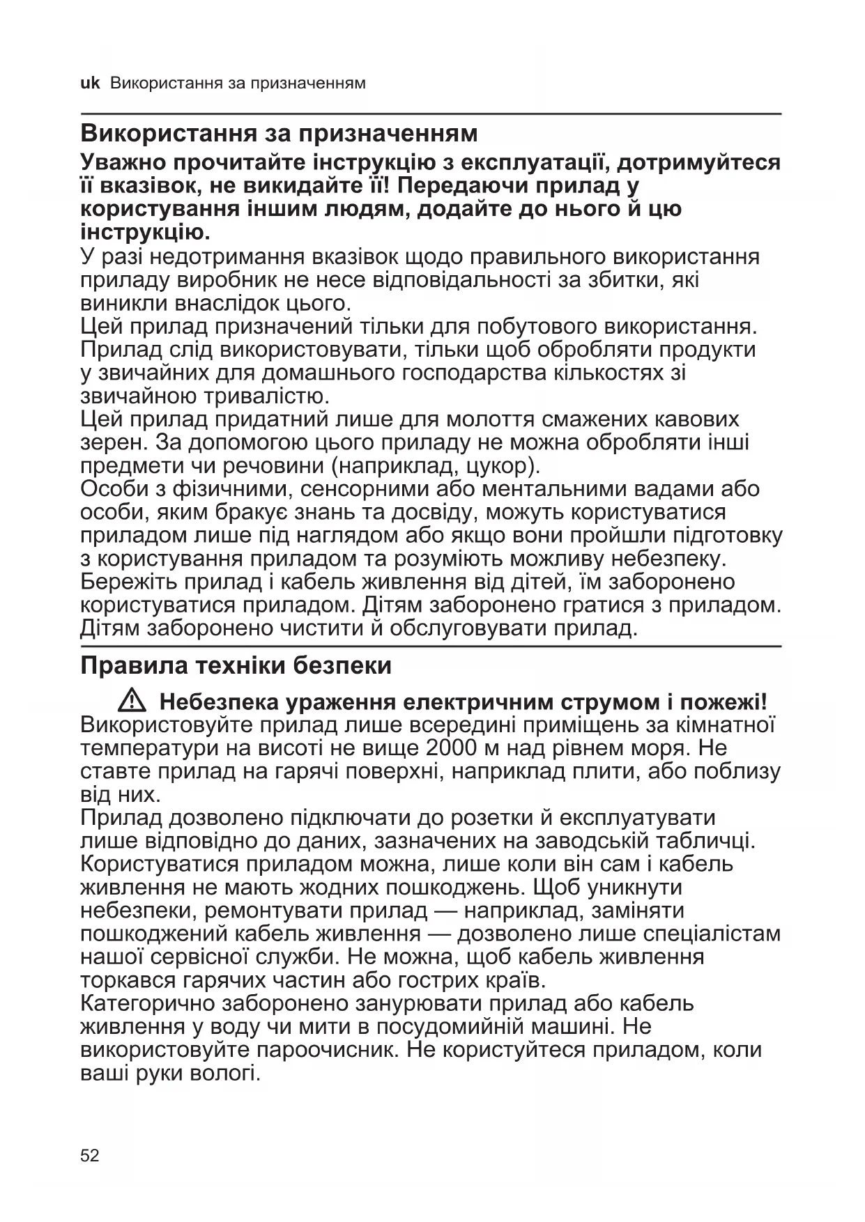 garanciális szolgáltatásokat a vásárlásnál kapott, szabályosan kitöltött garanciajeggyel lehet igénybevenni, amely minden egyéb garanciális feltételt is részletesen ismertet. Minőségtanúsítás: A 2/1984. (111.10) BkM-IpM számú rendelete alapján, mint forgalmazó tanúsítjuk, hogy a készülék a vásárlási tájékoztatóban közölt adatoknak megfelel. A változtatások jogát fenntartjuk.52 uk Використання за призначенням Використання за призначенням Уважно прочитайте інструкцію з експлуатації, дотримуйтеся її вказівок, не викидайте її! Передаючи прилад у користування іншим людям, додайте до нього й цю інструкцію. У разі недотримання вказівок щодо правильного використання приладу виробник не несе відповідальності за збитки, які виникли внаслідок цього. Цей прилад призначений тільки для побутового використання. Прилад слід використовувати, тільки щоб обробляти продукти у звичайних для домашнього господарства кількостях зі звичайною тривалістю. Цей прилад придатний лише для молоття смажених кавових зерен. За допомогою цього приладу не можна обробляти інші предмети чи речовини (наприклад, цукор). Особи з фізичними, сенсорними або ментальними вадами або особи, яким бракує знань та досвіду, можуть користуватися приладом лише під наглядом або якщо вони пройшли підготовку з користування приладом та розуміють можливу небезпеку. Бережіть прилад і кабель живлення від дітей, їм заборонено користуватися приладом. Дітям заборонено гратися з приладом. Дітям заборонено чистити й обслуговувати прилад. Правила техніки безпеки W Небезпека ураження електричним струмом і пожежі! Використовуйте прилад лише всередині приміщень за кімнатної температури на висоті не вище 2000 м над рівнем моря. Не ставте прилад на гарячі поверхні, наприклад плити, або поблизу