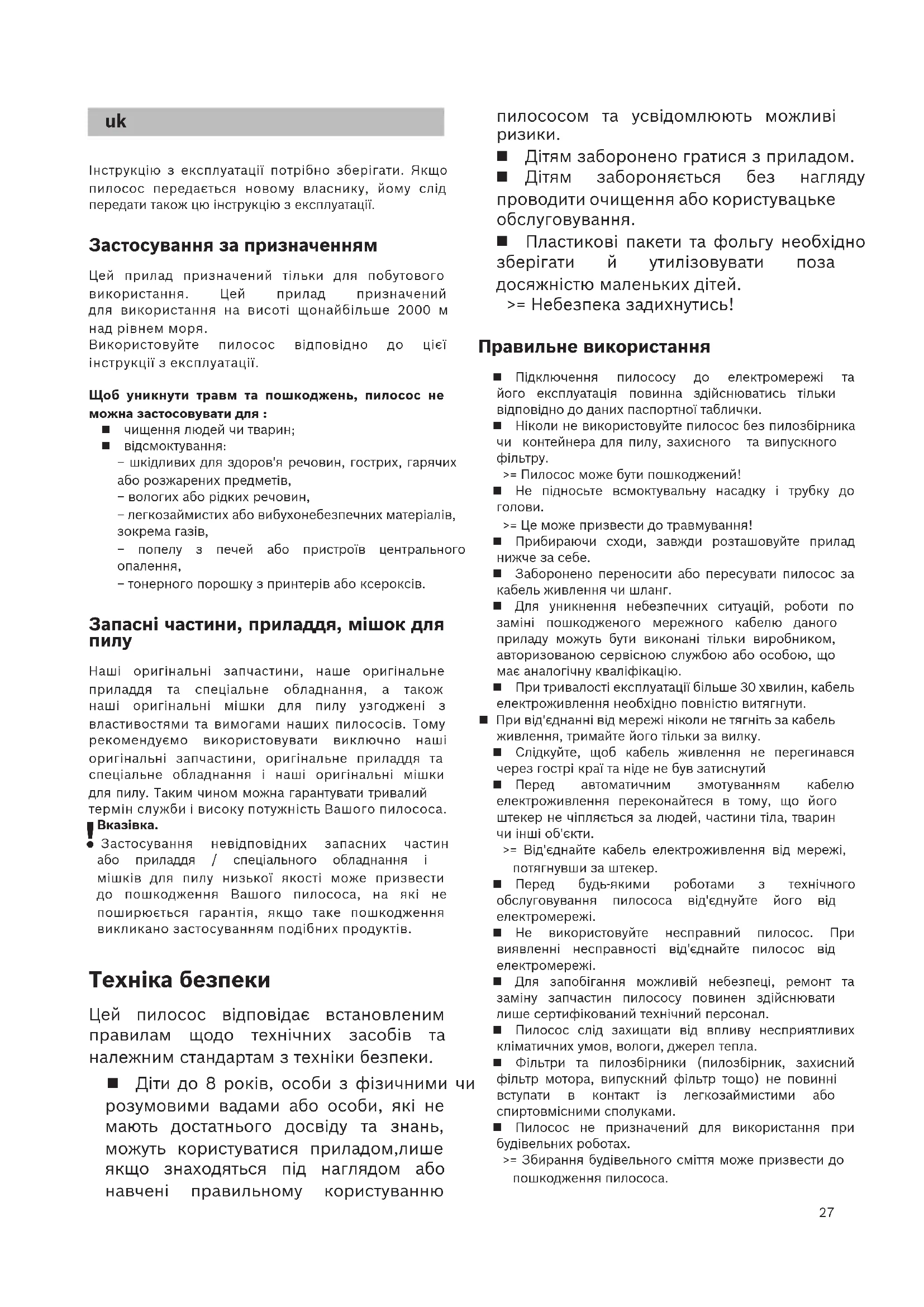 Застосування невідповідних запасних частин або приладдя / спеціального обладнання і мішків для пилу низької якості може призвести до пошкодження Вашого пилососа, на які не поширюється гарантія, якщо таке пошкодження викликано застосуванням подібних продуктів. Техніка безпеки Цей пилосос відповідає встановленим правилам щодо технічних засобів та належним стандартам з техніки безпеки. Діти до 8 років, особи з фізичними чи розумовими вадами або особи, які не мають достатнього досвіду та знань, можуть користуватися приладом,лише якщо знаходяться під наглядом або навчені правильному користуванню28