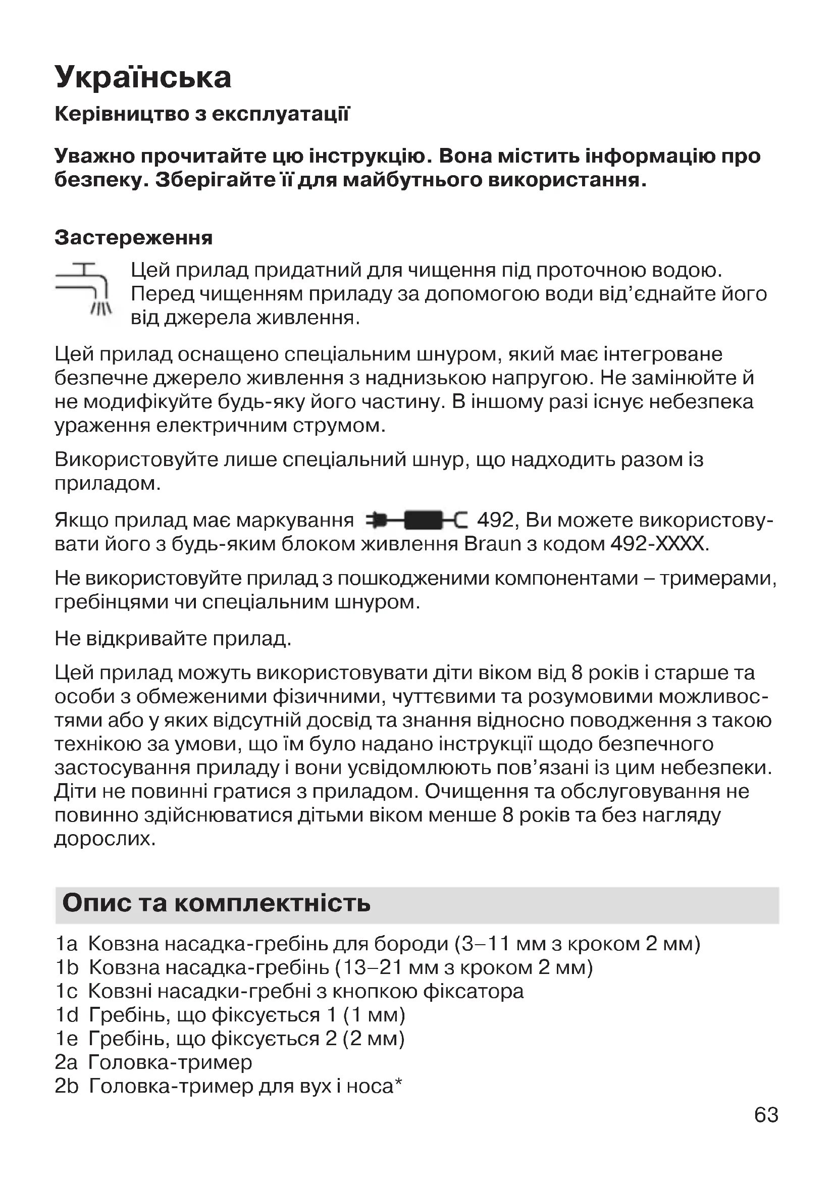 Якщо прилад має маркування 492, Ви можете використову- вати його з будь-яким блоком живлення Braun з кодом 492-XXXX. Не використовуйте прилад з пошкодженими компонентами – тримерами, гребінцями чи спеціальним шнуром. Не відкривайте прилад. Цей прилад можуть використовувати діти віком від 8 років і старше та особи з обмеженими фізичними, чуттєвими та розумовими можливос- тями або у яких відсутній досвід та знання відносно поводження з такою технікою за умови, що їм було надано інструкції щодо безпечного застосування приладу і вони усвідомлюють пов’язані із цим небезпеки. Діти не повинні гратися з приладом. Очищення та обслуговування не повинно здійснюватися дітьми віком менше 8 років та без нагляду