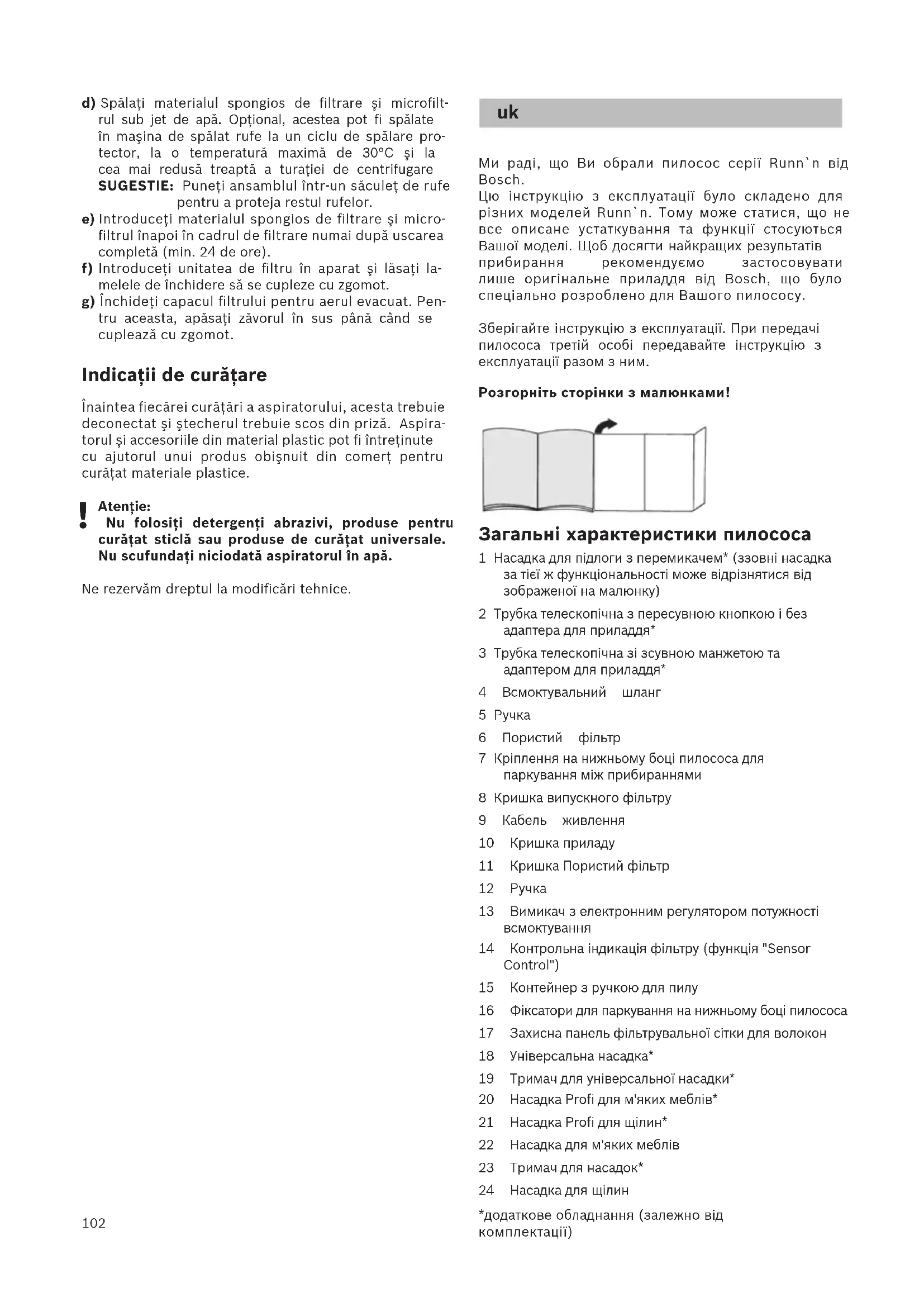 Atenţie: Nu folosiţi detergenţi abrazivi, produse pentru curăţat sticlă sau produse de curăţat universale. Nu scufundaţi niciodată aspiratorul în apă. Ne rezervăm dreptul la modificări tehnice. Ми раді, що Ви обрали пилосос серії Runn`n від Bosch. Цю інструкцію з експлуатації було складено для різних моделей Runn`n. Тому може статися, що не все описане устаткування та функції стосуються Вашої моделі. Щоб досягти найкращих результатів прибирання рекомендуємо застосовувати лише оригінальне приладдя від Bosch, що було спеціально розроблено для Вашого пилососу. Зберігайте інструкцію з експлуатації. При передачі пилососа третій особі передавайте інструкцію з експлуатації разом з ним. Розгорніть сторінки з малюнками! Загальні характеристики пилососа 1 Насадка для підлоги з перемикачем* (ззовні насадка за тієї ж функціональності може відрізнятися від зображеної на малюнку) 2 Трубка телескопічна з пересувною кнопкою і без адаптера для приладдя* 3 Трубка телескопічна зі зсувною манжетою та адаптером для приладдя* 4 Всмоктувальний шланг 5 Ручка 6 Пористий фільтр 7 Кріплення на нижньому боці пилососа для паркування між прибираннями 8 Кришка випускного фільтру 9 Кабель живлення 10 Кришка приладу 11 Кришка Пористий фільтр 12 Ручка 13 Вимикач з електронним регулятором потужності всмоктування 14 Контрольна індикація фільтру (функція "Sensor Control") 15 Контейнер з ручкою для пилу 16 Фіксатори для паркування на нижньому боці пилососа 17 Захисна панель фільтрувальної сітки для волокон 18 Універсальна насадка* 19 Тримач для універсальної насадки* 20 Насадка Profi для м'яких меблів* 21 Насадка Profi для щілин* 22 Насадка для м'яких меблів 23 Тримач для насадок* 24 Насадка для щілин