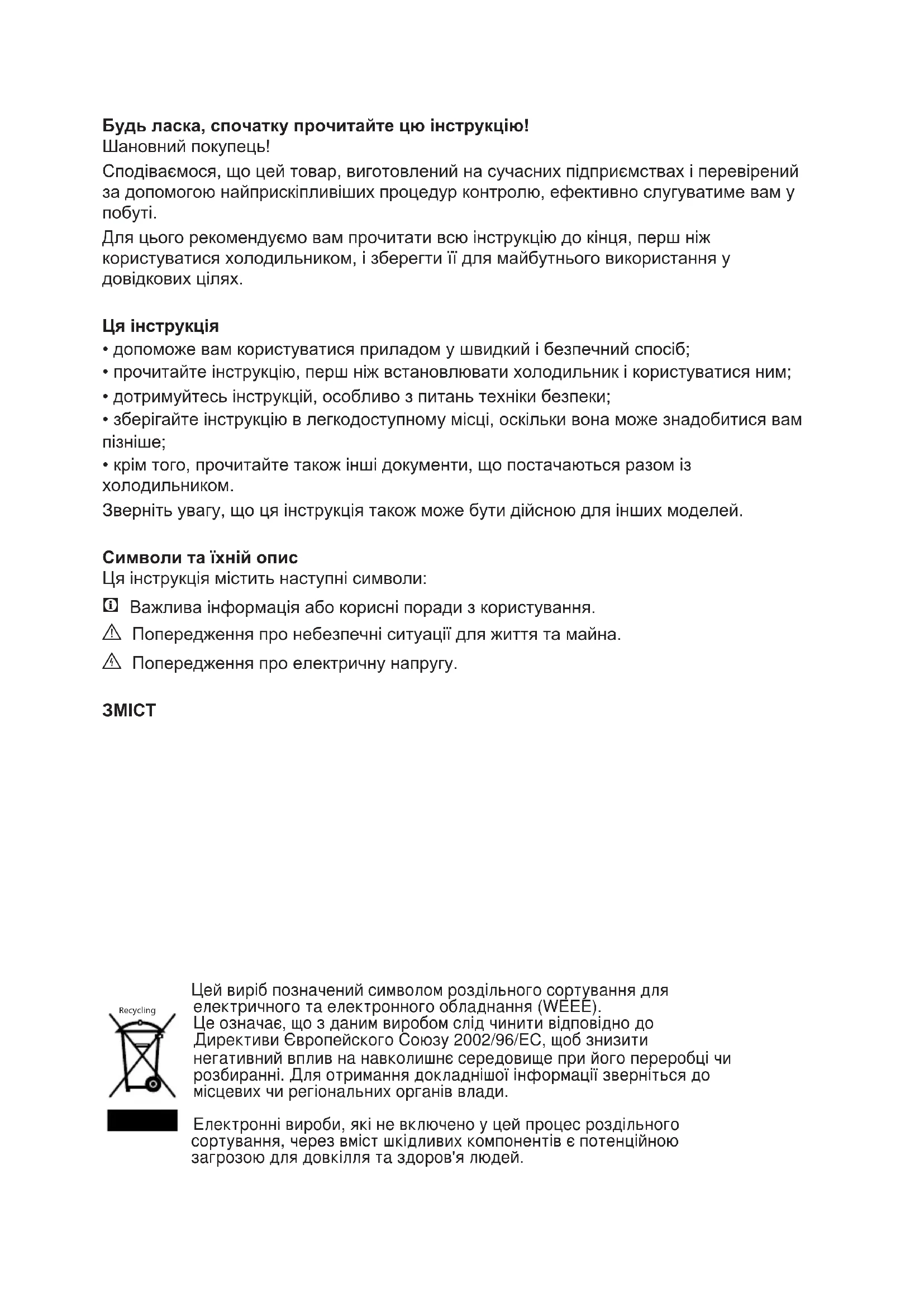 Для цього рекомендуємо вам прочитати всю інструкцію до кінця, перш ніж користуватися холодильником, і зберегти її для майбутнього використання у довідкових цілях. Ця інструкція
