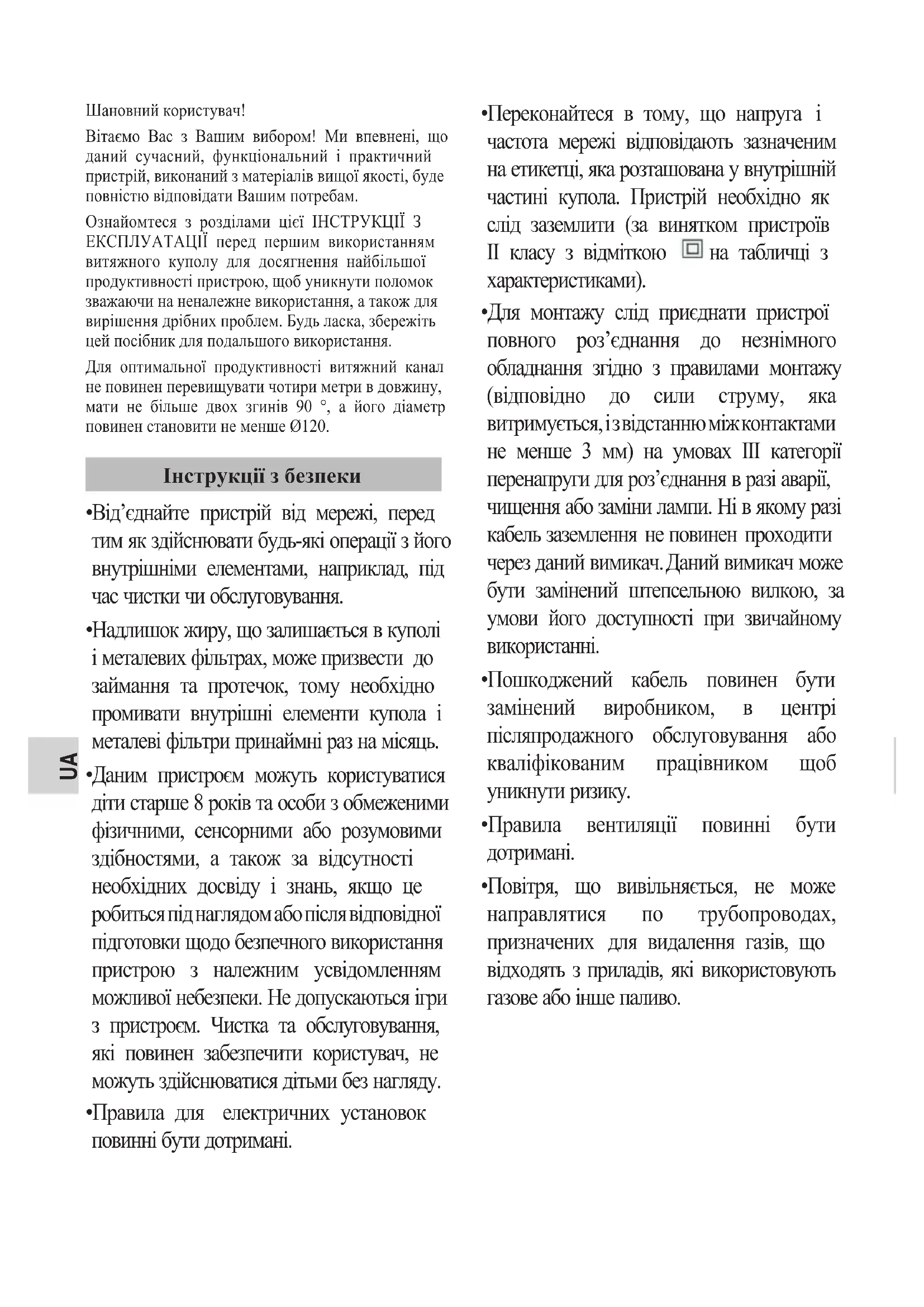 3-3UA Шановний користувач! Вітаємо Вас з Вашим вибором! Ми впевнені, що даний сучасний, функціональний і практичний пристрій, виконаний з матеріалів вищої якості, буде повністю відповідати Вашим потребам. Ознайомтеся з розділами цієї ІНСТРУКЦІЇ З ЕКСПЛУАТАЦІЇ перед першим використанням витяжного куполу для досягнення найбільшої продуктивності пристрою, щоб уникнути поломок зважаючи на неналежне використання, а також для вирішення дрібних проблем. Будь ласка, збережіть цей посібник для подальшого використання. Для оптимальної продуктивності витяжний канал не повинен перевищувати чотири метри в довжину, мати не більше двох згинів 90 °, а його діаметр повинен становити не менше Ø120.