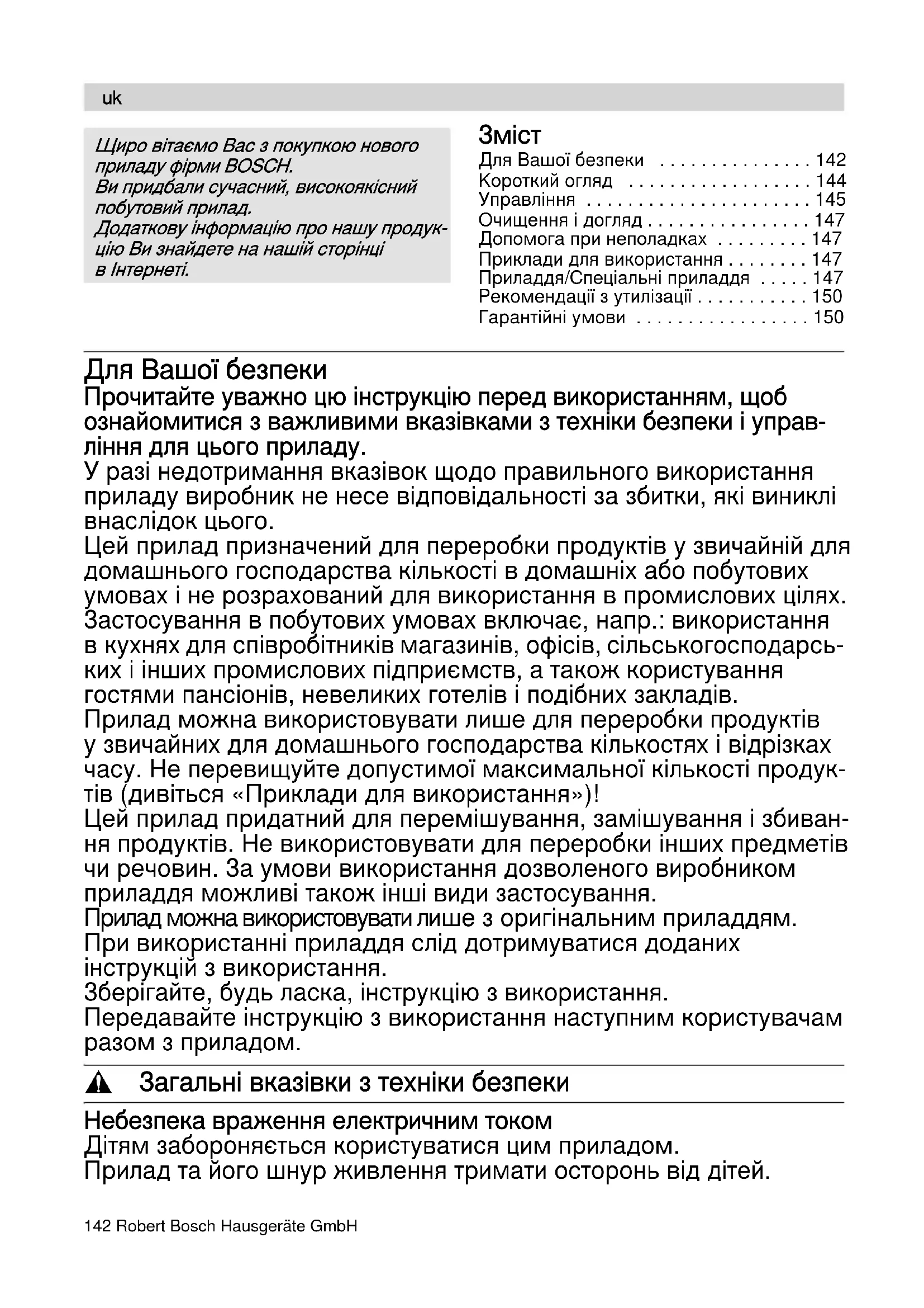 - Гарантійні умови Для Вашої безпеки Прочитайте уважно цю інструкцію перед використанням, щоб ознайомитися з важливими вказівками з техніки безпеки і управ- ління для цього приладу. У разі недотримання вказівок щодо правильного використання приладу виробник не несе відповідальності за збитки, які виниклі внаслідок цього. Цей прилад призначений для переробки продуктів у звичайній для домашнього господарства кількості в домашніх або побутових умовах і не розрахований для використання в промислових цілях. Застосування в побутових умовах включає, напр.: використання в кухнях для співробітників магазинів, офісів, сільськогосподарсь- ких і інших промислових підприємств, а також користування гостями пансіонів, невеликих готелів і подібних закладів. Прилад можна використовувати лише для переробки продуктів у звичайних для домашнього господарства кількостях і відрізках часу. Не перевищуйте допустимої максимальної кількості продук- тів (дивіться «Приклади для використання»)! Цей прилад придатний для перемішування, замішування і збиван- ня продуктів. Hе використовувати для переробки інших предметів чи речовин. За умови використання дозволеного виробником приладдя можливі також інші види застосування. Прилад можна використовувати лише з оригінальним приладдям. При використанні приладдя слiд дотримуватися доданих інструкцій з використання. Зберігайте, будь ласка, інструкцію з використання. Передавайте інструкцію з використання наступним користувачам разом з приладом. , Загальні вказівки з техніки безпеки Небезпека враження електричним током Дітям забороняється користуватися цим приладом. Прилад та його шнур живлення тримати осторонь від дітей. p. 150