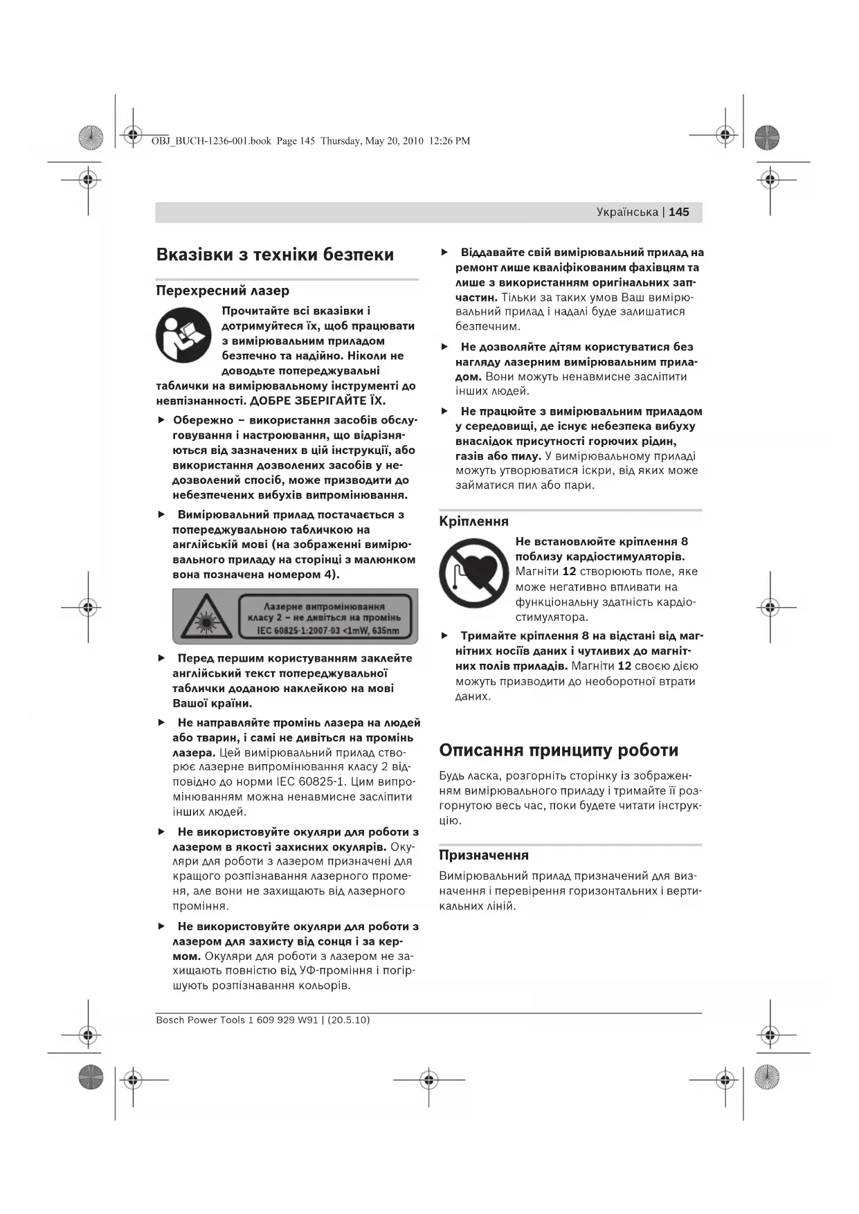 f Не використовуйте окуляри для роботи з лазером для захисту від сонця і за кер- мом. Окуляри для роботи з лазером не за- хищають повністю від УФ-проміння і погір- шують розпізнавання кольорів. f Віддавайте свій вимірювальний прилад на ремонт лише кваліфікованим фахівцям та лише з використанням оригінальних зап- частин. Тільки за таких умов Ваш вимірю- вальний прилад і надалі буде залишатися