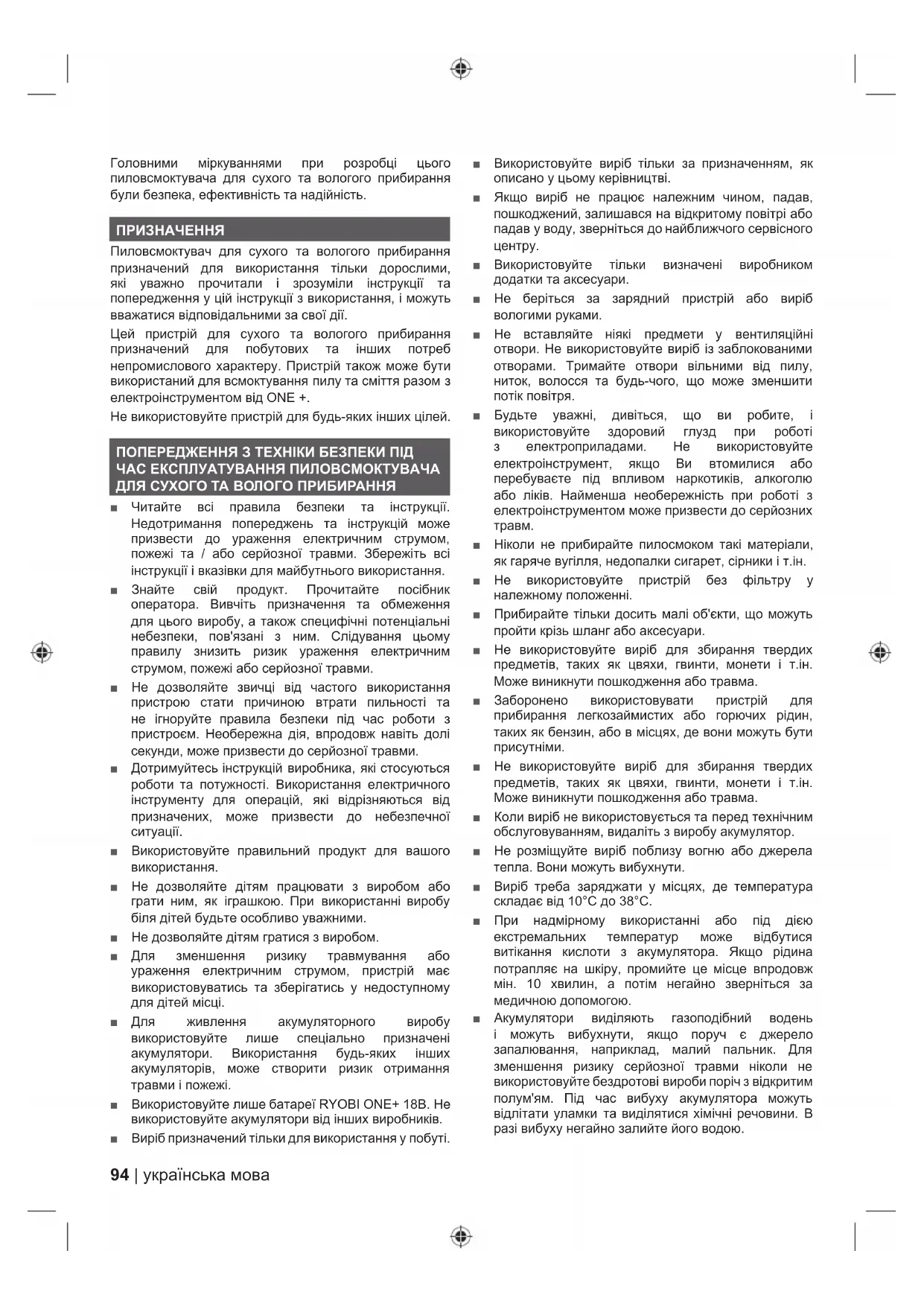 (Без предупредителен символ за безопасност) Указва ситуация, която може да доведе до имуществени щети.94 | українська мова Головними міркуваннями при розробці цього пиловсмоктувача для сухого та вологого прибирання були безпека, ефективність та надійність. ПРИЗНАЧЕННЯ Пиловсмоктувач для сухого та вологого прибирання призначений для використання тільки дорослими, які уважно прочитали і зрозуміли інструкції та попередження у цій інструкції з використання, і можуть вважатися відповідальними за свої дії. Цей пристрій для сухого та вологого прибирання призначений для побутових та інших потреб непромислового характеру. Пристрій також може бути використаний для всмоктування пилу та сміття разом з електроінструментом від ONE +. Не використовуйте пристрій для будь-яких інших цілей. ПОПЕРЕДЖЕННЯ З ТЕХНІКИ БЕЗПЕКИ ПІД ЧАС ЕКСПЛУАТУВАННЯ ПИЛОВСМОКТУВАЧА ДЛЯ СУХОГО ТА ВОЛОГО ПРИБИРАННЯ ■ Читайте всі правила безпеки та інструкції. Недотримання попереджень та інструкцій може призвести до ураження електричним струмом, пожежі та / або серйозної травми. Збережіть всі інструкції і вказівки для майбутнього використання. ■ Знайте свій продукт. Прочитайте посібник оператора. Вивчіть призначення та обмеження для цього виробу, а також специфічні потенціальні небезпеки, пов'язані з ним. Слідування цьому правилу знизить ризик ураження електричним струмом, пожежі або серйозної травми. ■ Не дозволяйте звичці від частого використання пристрою стати причиною втрати пильності та не ігноруйте правила безпеки під час роботи з пристроєм. Необережна дія, впродовж навіть долі секунди, може призвести до серйозної травми. ■ Дотримуйтесь інструкцій виробника, які стосуються роботи та потужності. Використання електричного інструменту для операцій, які відрізняються від призначених, може призвести до небезпечної