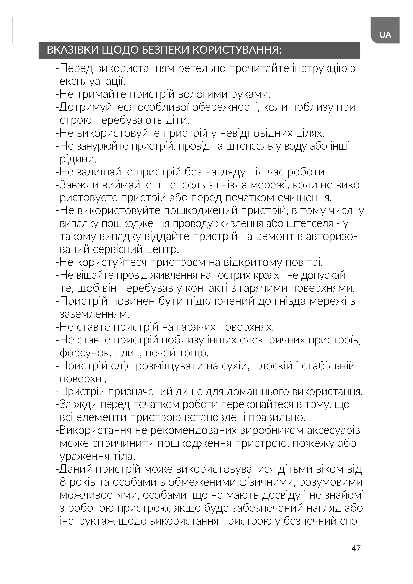 Завжди перед початком роботи переконайтеся в тому, що всі елементи пристрою встановлені правильно. - Використання не рекомендованих виробником аксесуарів може спричинити пошкодження пристрою, пожежу або ураження тіла. - Даний пристрій може використовуватися дітьми віком від 8 років та особами з обмеженими фізичними, розумовими можливостями, особами, що не мають досвіду і не знайомі з роботою пристрою, якщо буде забезпечений нагляд або інструктаж щодо використання пристрою у безпечний спо-48