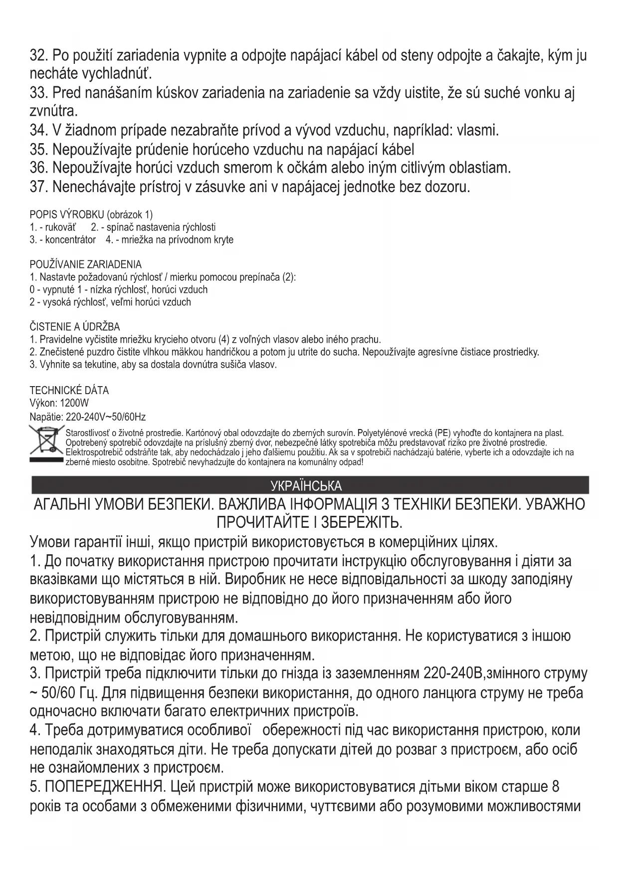 використовуйте агресивні миючі засоби. ТЕХНІЧНІ ДАНІ У інтересах навколишнього середовища. Будь ласка, віддайте картонну упаковку в місце збору мукулатури. Політиленові мішки (PE) викинути в смітник для пластику. Відпрацьований пристрій повинен бути відправлений у відповідну точку зберігання, тому що в пристрої є небезпечні інгредієнти, які можуть становити загрозу навколишньому середовищу. Електричний пристрій потрібно повернути так, щоб обмежити його повторне використання. Якщо у пристрої є батерейки, то потрібно їх витягнути і віддати до відповідного пунтку.1- لﺑﻗ مادﺧﺗﺳا ﺞﺗﻧﻣﻟا ، ﻰﺟرﯾ ةءارﻘﻟا ﺔﯾﺎﻧﻌﺑ لﺎﺛﺗﻣﻻاو ﺎﻣﺋاد تادﺎﺷرﻺﻟ ﺔﯾﻟﺎﺗﻟا. ﺔﻛرﺷﻟا ﺔﻌﻧﺻﻣﻟا تﺳﯾﻟ ﺔﻟوؤﺳﻣ نﻋ يأ رارﺿأ ﺔﺟﺗﺎﻧ نﻋ يأ ءوﺳ مادﺧﺗﺳا.