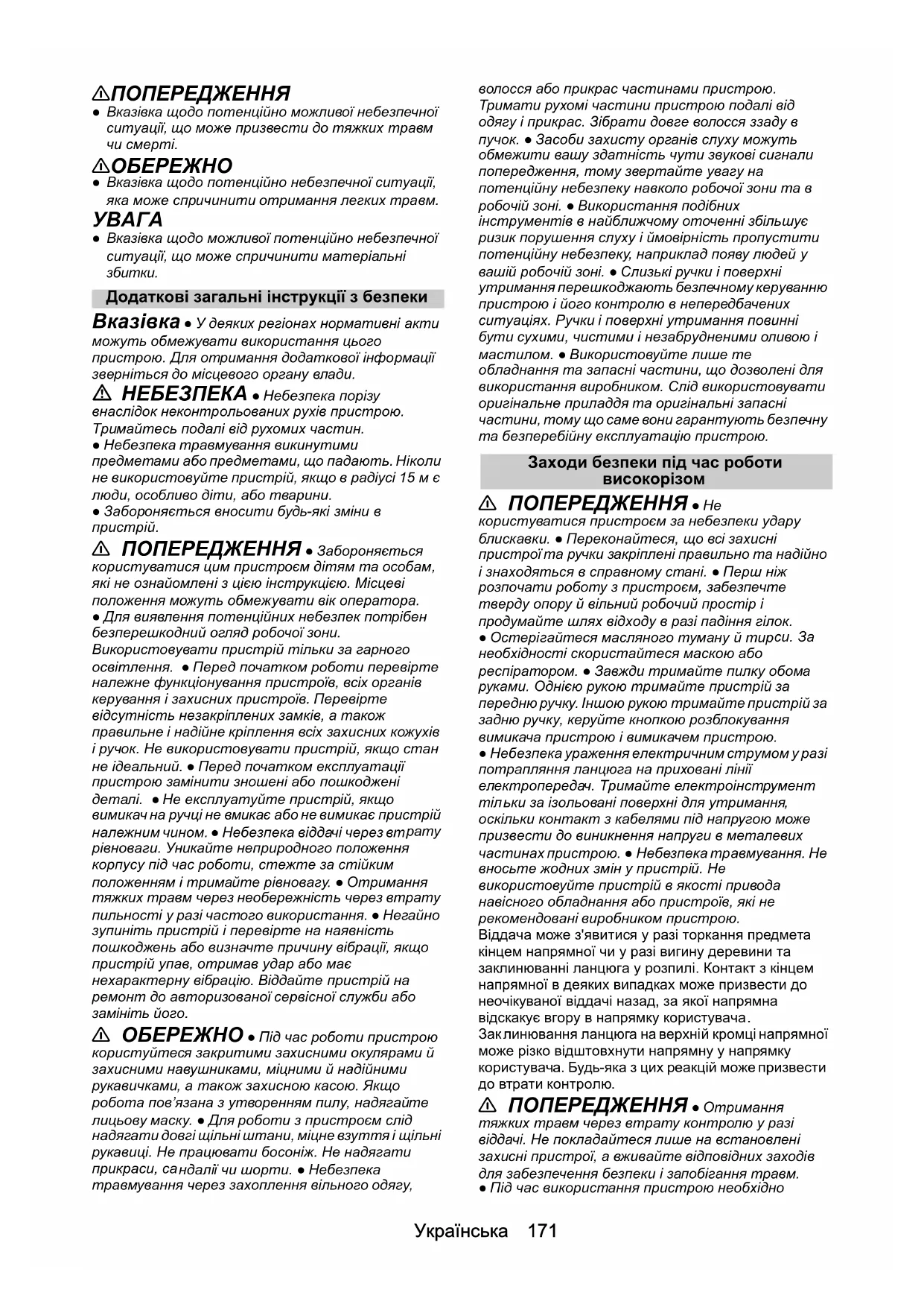 бладнання та запасні частини, що дозволені для використання виробником. Слід використовувати оригінальне приладдя та оригінальні запасні частини, тому що саме вони гарантують безпечну та безперебійну експлуатацію пристрою. Заходи безпеки під час роботи високорізом 몇 ПОПЕРЕДЖЕННЯ ● Не користуватися пристроєм за небезпеки удару блискавки. ● Переконайтеся, що всі захисні пристрої та ручки закріплені правильно та надійно і знаходяться в справному стані. ● Перш ніж розпочати роботу з пристроєм, забезпечте тверду опору й вільний робочий простір і продумайте шлях відходу в разі падіння гілок. ● Остерігайтеся масляного туману й тир