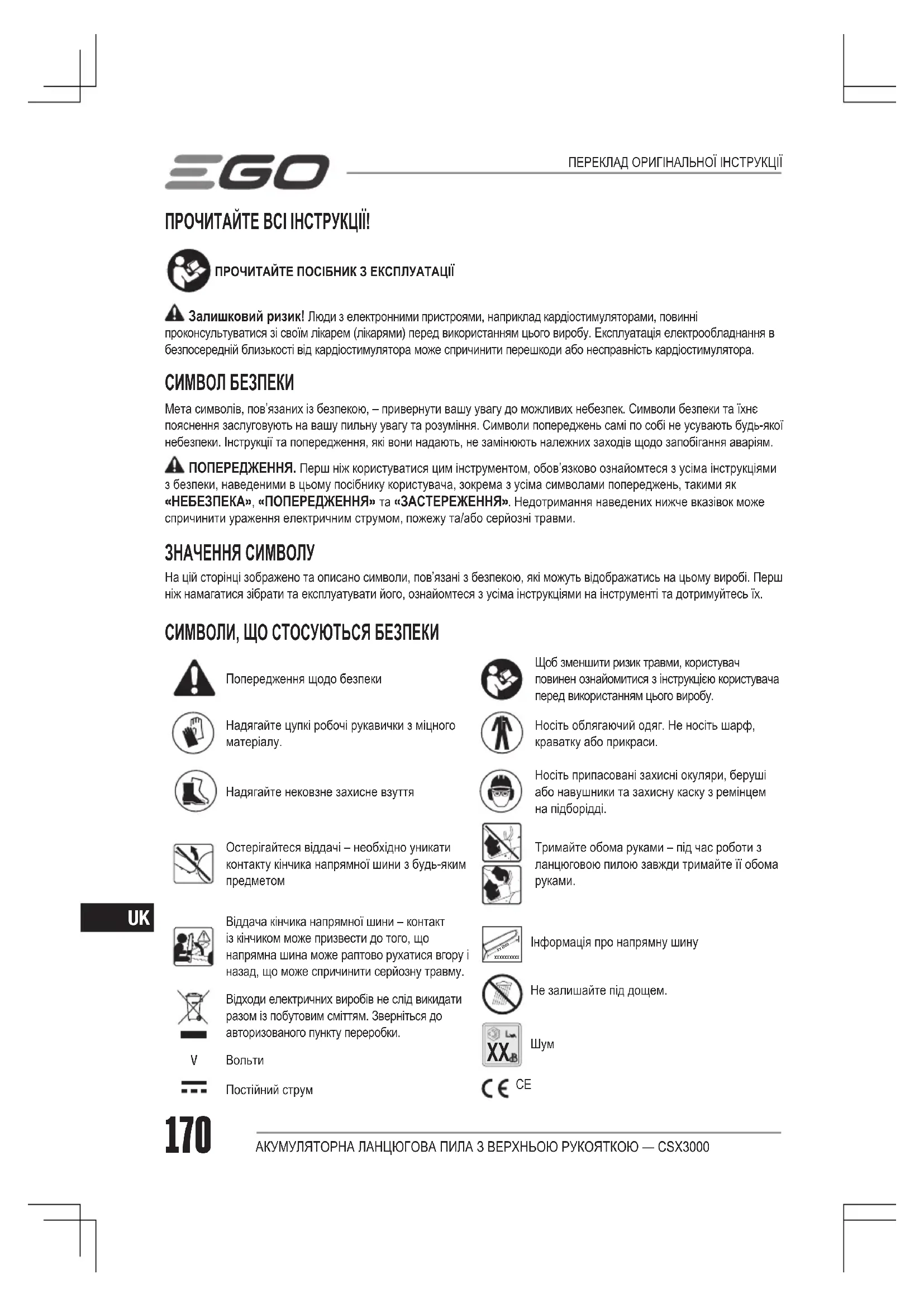 АКУМУЛЯТОРНА ЛАНЦЮГОВА ПИЛА З ВЕРХНЬОЮ РУКОЯТКОЮ — CSX3000 ПРОЧИТАЙТЕ ВСІ ІНСТРУКЦІЇ! ПРОЧИТАЙТЕ ПОСІБНИК З ЕКСПЛУАТАЦІЇ Залишковий ризик! Люди з електронними пристроями, наприклад кардіостимуляторами, повинні проконсультуватися зі своїм лікарем (лікарями) перед використанням цього виробу. Експлуатація електрообладнання в безпосередній близькості від кардіостимулятора може спричинити перешкоди або несправність кардіостимулятора. СИМВОЛ БЕЗПЕКИ Мета символів, пов’язаних із безпекою, – привернути вашу увагу до можливих небезпек. Символи безпеки та їхнє пояснення заслуговують на вашу пильну увагу та розуміння. Символи попереджень самі по собі не усувають будь-якої небезпеки. Інструкції та попередження, які вони надають, не замінюють належних заходів щодо запобігання аваріям. ПОПЕРЕДЖЕННЯ. Перш ніж користуватися цим інструментом, обов’язково ознайомтеся з усіма інструкціями з безпеки, наведеними в цьому посібнику користувача, зокрема з усіма символами попереджень, такими як «НЕБЕЗПЕКА», «ПОПЕРЕДЖЕННЯ» та «ЗАСТЕРЕЖЕННЯ». Недотримання наведених нижче вказівок може спричинити ураження електричним струмом, пожежу та/або серйозні травми. ЗНАЧЕННЯ СИМВОЛУ На цій сторінці зображено та описано символи, пов’язані з безпекою, які можуть відображатись на цьому виробі. Перш ніж намагатися зібрати та експлуатувати його, ознайомтеся з усіма інструкціями на інструменті та дотримуйтесь їх. СИМВОЛИ, ЩО СТОСУЮТЬСЯ БЕЗПЕКИ Попередження щодо безпекиЩоб зменшити ризик травми, користувач повинен ознайомитися з інструкцією користувача перед використанням цього виробу.Надягайте цупкі робочі рукавички з міцного матеріалу.Носіть облягаючий одяг. Не носіть шарф, краватку або прикраси.Надягайте нековзне захисне взуттяНосіть припасовані захисні окуляри, беруші або навушники та захисну каску з ремінцем на підборідді.Остерігайтеся віддачі – необхідно уникати контакту кінчика напрямної шини з будь-яким предметомТримайте обома руками – під час роботи з ланцюговою пилою завжди тримайте її обома руками.Віддача кінчика напрямної шини – контакт із кінчиком може призвести до того, що напрямна шина може раптово рухатися вгору і назад, що може спричинити серйозну травму.Відходи електричних виробів не слід викидати разом із побутовим сміттям. Зверніться до авторизованого пункту переробки. ВольтиПостійний струмПЕРЕКЛАД ОРИГІНАЛЬНОЇ ІНСТРУКЦІЇ xxxxxxxxxx xx mm Інформація про напрямну шину Не залишайте під дощем.
