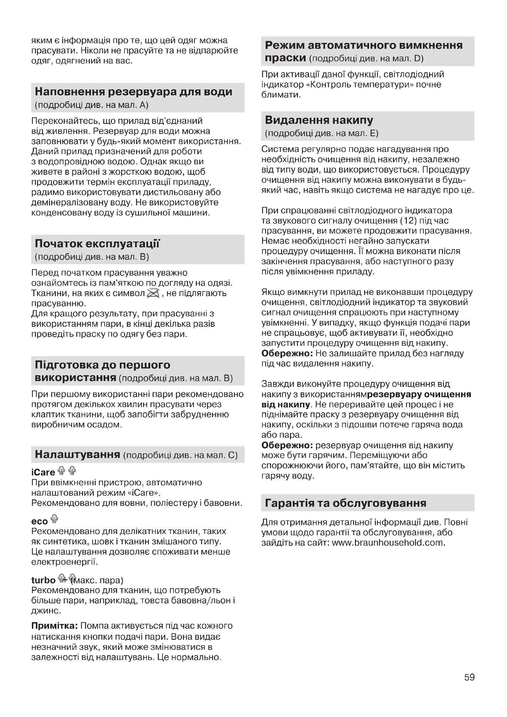 1 Світлодіодний індикатор «Контроль температури» 2 Кнопка подачі пари 3 П'ятка 4 Підставка для праски 5 Подвійний дріт / Відсік для зберігання 6 Кришка резервуару для води 7 Резервуар для води 8 Шнур живлення / Відсік для зберігання 9 ндикатор режиму «Eco» 10 Індикатор режиму «iCare» 11 Кнопка перемикання режимів 12 Світлодіодний індикатор системи очищення 13 Кнопка очищення 14 Система блокування 15 Резервуар очищення від накипу Цільове призначення Прилад може використовуватись виключно для прасування одягу, на пам'ятці по догляду за 5712812391_IS_21xx_INT.indd 58 26.06.20 12:1359 яким є інформація про те, що цей одяг можна прасувати. Ніколи не прасуйте та не відпарюйте одяг, одягнений на вас. Наповнення резервуара для води (подробиці див. на мал. A) Переконайтесь, що прилад від'єднаний від живлення. Резервуар для води можна заповнювати у будь-який момент використання. Даний прилад призначений для роботи з водопровідною водою. Однак якщо ви живете в районі з жорсткою водою, щоб продовжити термін експлуатації приладу, радимо використовувати дистильовану або демінералізовану воду. Не використовуйте конденсовану воду із сушильної машини. Початок експлуатації (подробиці див. на мал. B) Перед початком прасування уважно ознайомтесь із пам'яткою по догляду на одязі. Тканини, на яких є символ , не підлягають прасуванню. Для кращого результату, при прасуванні з використанням пари, в кінці декілька разів проведіть праску по одягу без пари. Підготовка до першого використання (подробиці див. на мал. B) При першому використанні пари рекомендовано протягом декількох хвилин прасувати через клаптик тканини, щоб запобігти забрудненню виробничим осадом. Налаштування (подробиці див. на мал. C) iCare При ввімкненні пристрою, автоматично налаштований режим «iCare». Рекомендовано для вовни, поліестеру і бавовни. eco Рекомендовано для делікатних тканин, таких як синтетика, шовк і тканин змішаного типу. Це налаштування дозволяє споживати менше електроенергії. turbo + (макс. пара) Рекомендовано для тканин, що потребують більше пари, наприклад, товста бавовна/льон і