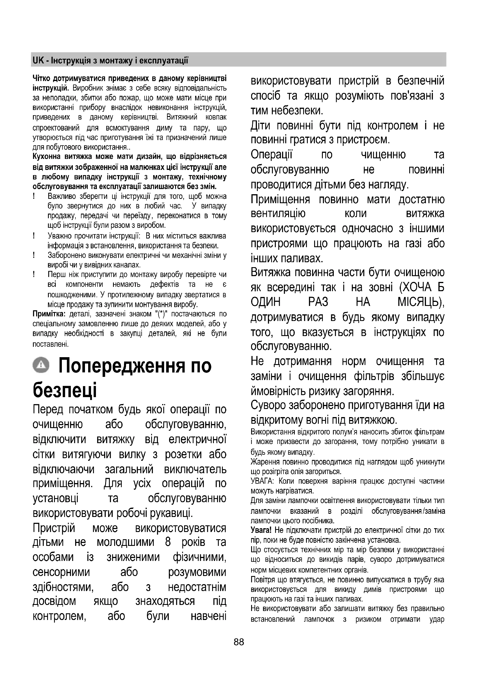 Перед початком будь якої операції по очищенню або обслуговуванню, відключити витяжку від електричної сітки витягуючи вилку з розетки або відключаючи загальний виключатель приміщення. Для усіх операцій по установці та обслуговуванню використовувати робочі рукавиці. Пристрій може використовуватися дітьми не молодшими 8 років та особами із зниженими фізичними, сенсорними або розумовими здібностями, або з недостатнім досвідом якщо знаходяться під контролем, або були навчені використовувати пристрій в безпечній спосіб та якщо розуміють пов'язані з тим небезпеки. Діти повинні бути під контролем і не повинні гратися з пристроєм. Операції по чищенню та обслуговуванню не повинні проводитися дітьми без нагляду. Приміщення повинно мати достатню вентиляцію коли витяжка використовується одночасно з іншими пристроями що працюють на газі або інших паливах. Витяжка повинна части бути очищеною як всередині так і на зовні (ХОЧА Б ОДИН РАЗ НА МІСЯЦЬ), дотримуватися в будь якому випадку того, що вказується в інструкціях по обслуговуванню. Не дотримання норм очищення та заміни і очищення фільтрів збільшує ймовірність ризику загоряння. Суворо заборонено приготування їди на відкритому вогні під витяжкою. Використання відкритого полум’я наносить збиток фільтрам і може призвести до загорання, тому потрібно уникати в будь якому випадку. Жарення повинно проводитися під наглядом щоб уникнути що розігріта олія загориться. УВАГА: Коли поверхня варіння працює доступні частини можуть нагріватися. Для заміни лампочки освітлення використовувати тільки тип лампочки вказаний в розділі обслуговування