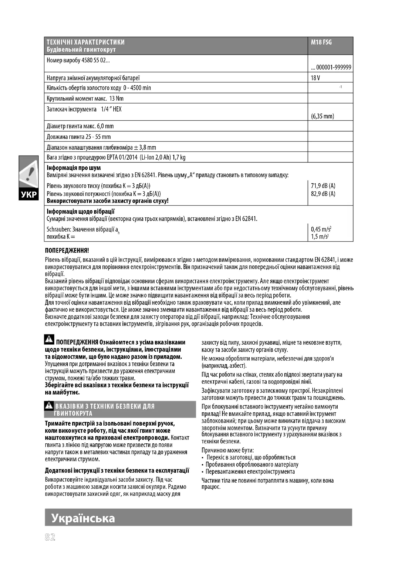 Вказаний рівень вібрації відповідає основним сферам використання електроінструменту. Але якщо електроінструмент використовується для іншої мети, з іншими вставними інструментами або при недостатньому технічному обслуговуванні, рівень вібрації може бути іншим. Це може значно підвищити навантаження від вібрації за весь період роботи. Для точної оцінки навантаження від вібрації необхідно також враховувати час, коли прилад вимкнений або увімкнений, але фактично не використовується. Це може значно зменшити навантаження від вібрації за весь період роботи. Визначте додаткові заходи безпеки для захисту оператора від дії вібрації, наприклад: Технічне обслуговування електроінструменту та вставних інструментів, зігрівання рук, організація робочих процесів. ПОПЕРЕДЖЕННЯ Ознайомтеся з усіма вказівками щодо техніки безпеки, інструкціями, ілюстраціями та відомостями, що було надано разом із приладом. Упущення при дотриманні вказівок з техніки безпеки та інструкцій можуть призвести до ураження електричним струмом, пожежі та/або тяжких травм. Зберігайте всі вказівки з техніки безпеки та інструкції на майбутнє. ВКАЗІВКИ З ТЕХНІКИ БЕЗПЕКИ ДЛЯ ГВИНТОКРУТА Тримайте пристрій за ізольовані поверхні ручок, коли виконуєте роботу, під час якої гвинт може наштовхнутися на приховані електропроводи. Контакт гвинта з лінією під напругою може призвести до появи напруги також в металевих частинах приладу та до ураження електричним струмом. Додаткові інструкції з техніки безпеки та експлуатації Використовуйте індивідуальні засоби захисту. Під час роботи з машиною завжди носити захисні окуляри. Радимо використовувати захисний одяг, як наприклад маску для захисту від пилу, захисні рукавиці, міцне та нековзне взуття, каску та засоби захисту органів слуху. Не можна обробляти матеріали, небезпечні для здоров‘я (наприклад, азбест). Під час роботи на стінах, стелях або підлозі звертати увагу на електричні кабелі, газові та водопровідні лінії. Зафіксувати заготовку в затискному пристрої. Незакріплені заготовки можуть привести до тяжких травм та пошкоджень. При блокуванні вставного інструменту негайно вимкнути прилад! Не вмикайте прилад, якщо вставний інструмент заблокований; при цьому може виникати віддача з високим зворотнім моментом. Визначити та усунути причину блокування вставного інструменту з урахуванням вказівок з техніки безпеки. Причиною може бути: