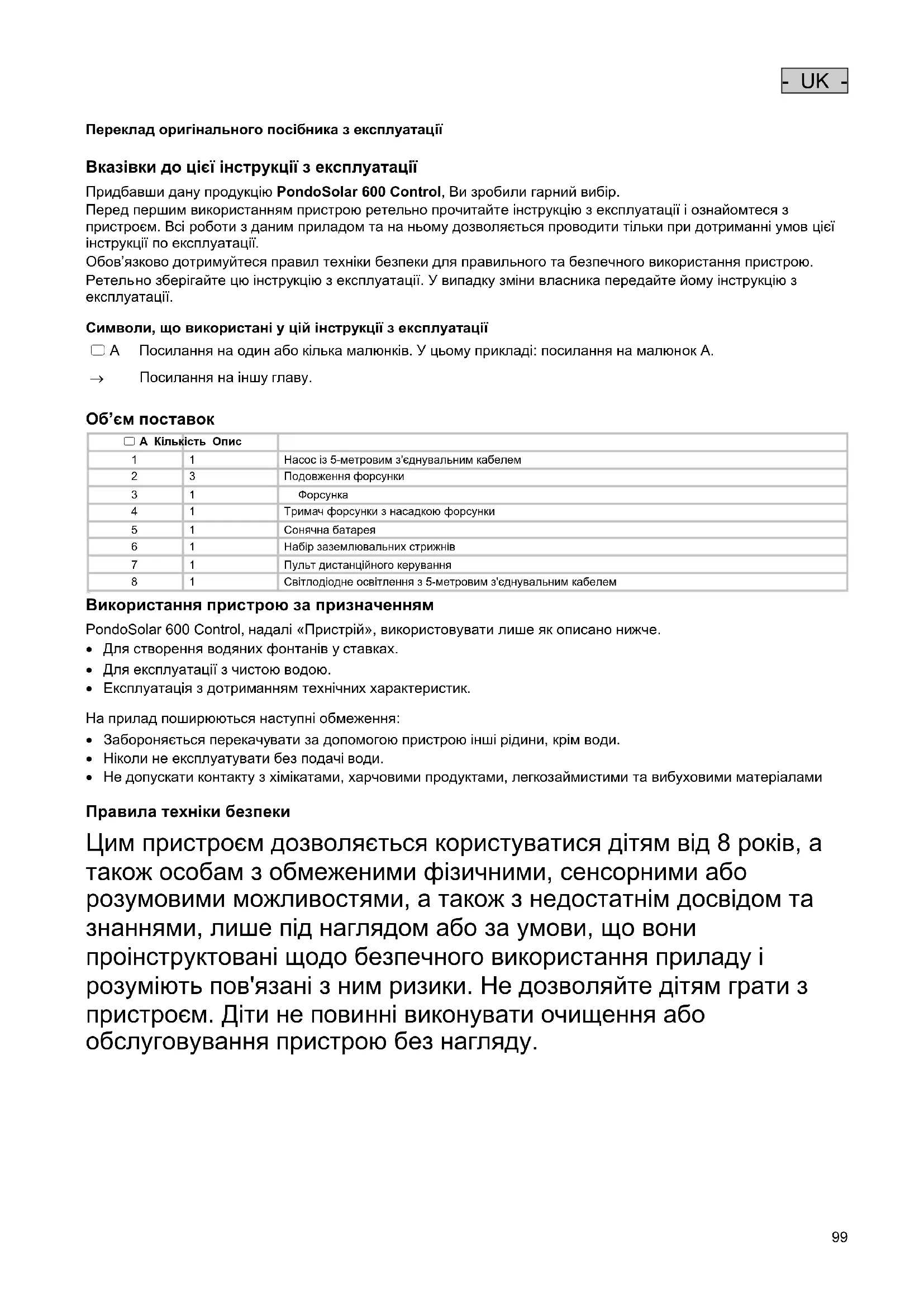 Вказівки до цієї інструкції з експлуатації Придбавши дану продукцію PondoSolar 600 Control, Ви зробили гарний вибір. Перед першим використанням пристрою ретельно прочитайте інструкцію з експлуатації і ознайомтеся з пристроєм. Всі роботи з даним приладом та на ньому дозволяється проводити тільки при дотриманні умов цієї інструкції по експлуатації. Обов’язково дотримуйтеся правил техніки безпеки для правильного та безпечного використання пристрою.