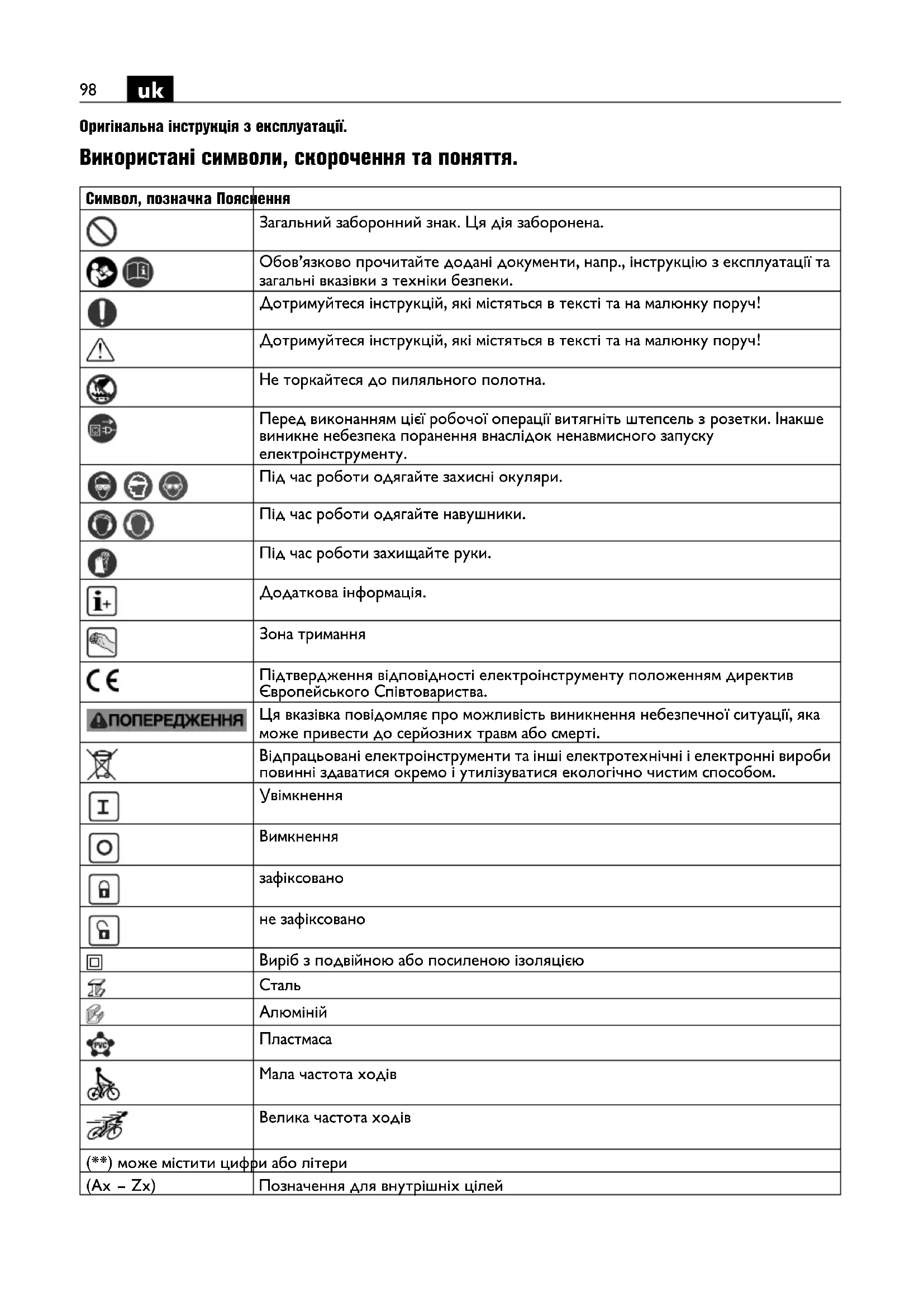 Оригінальна інструкція з експлуатації. Використані символи, скорочення та поняття. Символ, позначка Пояснення Загальний заборонний знак. Ця дія заборонена. Обов’язково прочитайте додані документи, напр., інструкцію з експлуатації та загальні вказівки з техніки безпеки. Дотримуйтеся інструкцій, які містяться в тексті та на малюнку поруч! Дотримуйтеся інструкцій, які містяться в тексті та на малюнку поруч! Не торкайтеся до пиляльного полотна. Перед виконанням цієї робочої операції витягніть штепсель з розетки. Інакше виникне небезпека поранення внаслідок ненавмисного запуску електроінструменту. Під час роботи одягайте захисні окуляри. Під час роботи одягайте навушники. Під час роботи захищайте руки. Додаткова інформація. Зона тримання Підтвердження відповідності електроінструменту положенням директив Європейського Співтовариства. Ця вказівка повідомляє про можливість виникнення небезпечної ситуації, яка може привести до серйозних травм або смерті. Відпрацьовані електроінструменти та інші електротехнічні і електронні вироби повинні здаватися окремо і утилізуватися екологічно чистим способом.