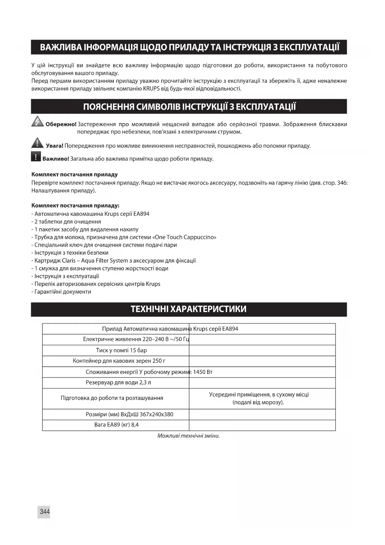 Важливо! Загальна або важлива примітка щодо роботи приладу. Комплект постачання приладу Перевірте комплект постачання приладу. Якщо не вистачає якогось аксесуару, подзвоніть на гарячу лінію (див. стор. 346: Налаштування приладу). Комплект постачання приладу: - Автоматична кавомашина Krups серії EA894 - 2 таблетки для очищення - 1 пакетик засобу для видалення накипу - Трубка для молока, призначена для системи «One Touch Cappuccino» - Спеціальний ключ для очищення системи подачі пари - Інструкція з техніки безпеки - Картридж Claris – Aqua Filter System з аксесуаром для фіксації - 1 смужка для визначення ступеню жорсткості води - Інструкція з експлуатації - Перелік авторизованих сервісних центрів Krups - Гарантійні документи ТЕХНІЧНІ ХАРАКТЕРИСТИКИ Прилад Автоматична кавомашина Krups серії EA894 Електричне живлення 220–240 В ~/50 Гц Тиск у помпі 15 бар Контейнер для кавових зерен 250 г Споживання енергії У робочому режимі: 1450 Вт Резервуар для води 2,3 л Підготовка до роботи та розташування Усередині приміщення, в сухому місці (подалі від морозу). Розміри (мм) ВxДxШ 367x240x380 Вага EA89 (кг) 8,4 Можливі технічні зміни. 344ОПИС ПРИЛАДУ A Ручка кришки резервуара для водиB Резервуар для водиC Контейнер для відпрацьованої кави.D Отвори подачі кави, що регулюються по висотіE Решітка та знімний піддон для крапельF Кришка контейнера для кавових зеренG Знімний блок One Touch CappuccinoG1 Демонтажний ключ для очищення контуру подачі париG2 Блок One touch cappuccinoH Трубка для молока та змішувачI Поплавець -індикатор рівня води Контейнер для кавових зеренJ Регулятор ступеня перемелення кавиK Отвір для таблетки для очищенняL Металевий млинок для перемелення кави жорнового типу Панель керуванняM Світлодіодний дисплейN Кнопка ON/OFF (УВІМК./ВИМК.)O Кнопки виборуПодробиці:Піддон для крапель використовується для збору води або кави, що витікає з приладу під час та після приготування. Важливо завжди залишати його на місці і спорожнювати регулярно, або щоразу як поплавці сигналізуватимуть про необхідність очищення.