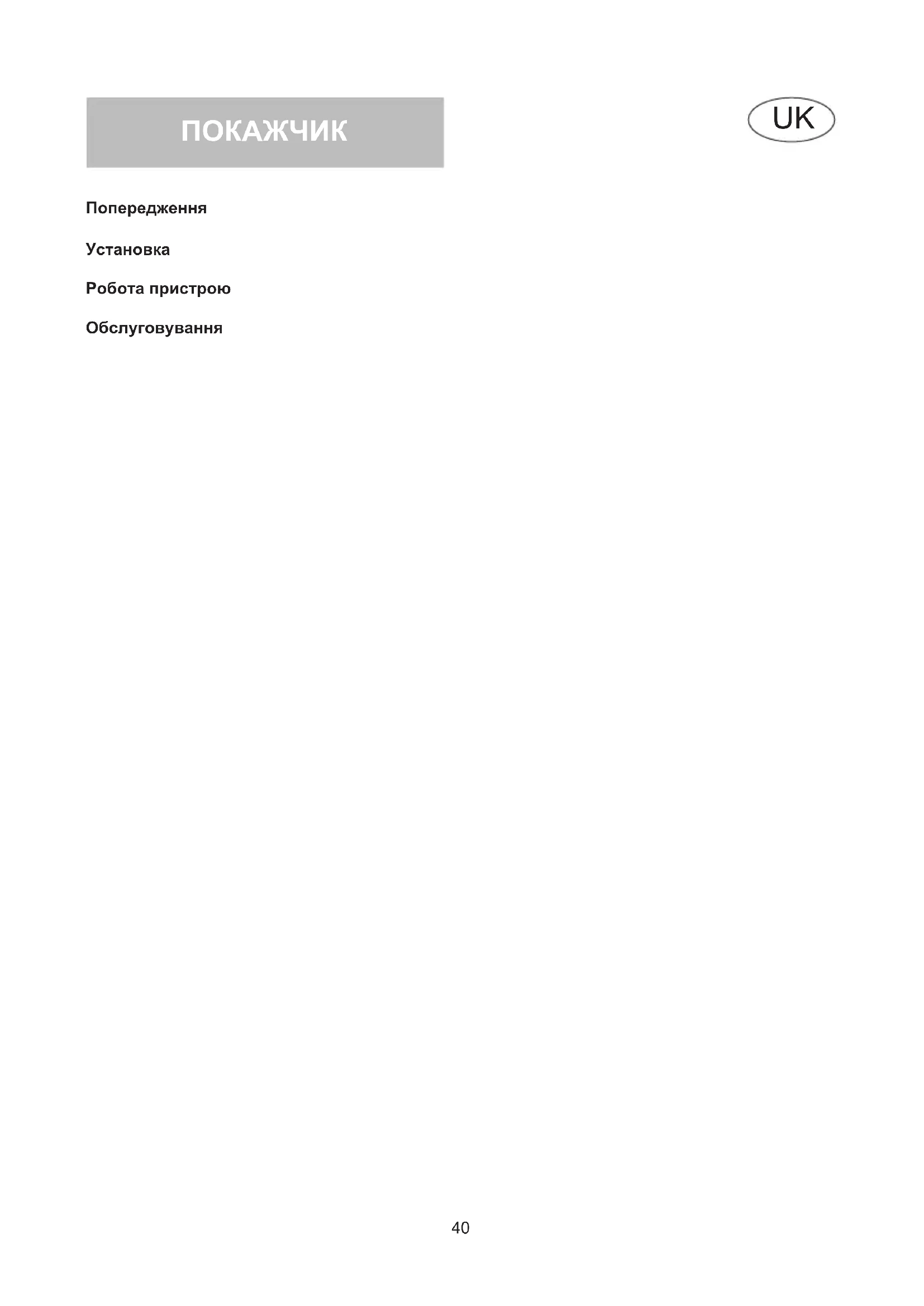 Якщо кабель живлення пошкоджений, його необхідно замінити спеціальним кабелем або готовим вузлом, який можна придбати у виробника або відділу технічного обслуговування. Якщо витяжка використовується одночасно з іншими приладами, що працюють на газі або іншому паливі, приміщення повинно мати достатню вентиляцію (це не стосується приладів, які просто випускають повітря назад у приміщення); Існує ймовірність пожежі, якщо очищення не буде виконуватися відповідно до інструкцій; Не готуйте страви фламбе (піддаючи обробці відкритим вогнем) під витяжкою. УВАГА: Зовнішні частини можуть становити небезпеку опіку, якщо їх використовувати разом із кухонними приладами. ПОПЕРЕДЖЕННЯ Відведення повітря приладу не повинно бути з’єднане з повітроводом, що використовується для відведення інших випарів, таких як системи опалення, водонагрівачі і т.д. Щодо викидів у зовнішнє повітря дотримуйтесь чинних
